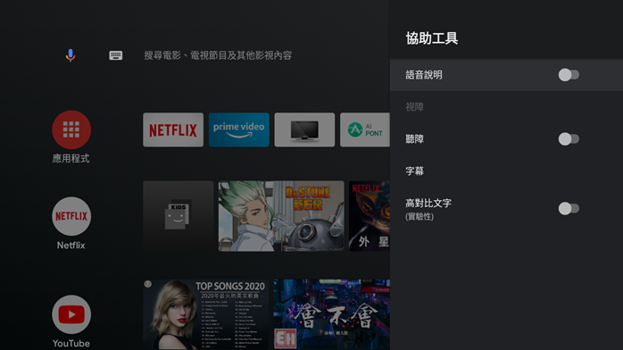 對於想要把電視購買給家中長輩的人使用的部份,也可以開啟協助工具的語音說明,讓不擅長使用智慧裝置的女朋友或者是視力上有老花的長輩有多一個輔助使用的項目,甚至是應用提供給聽障功能的友善設定也都能在 realme 智慧連網顯示器裡找到。