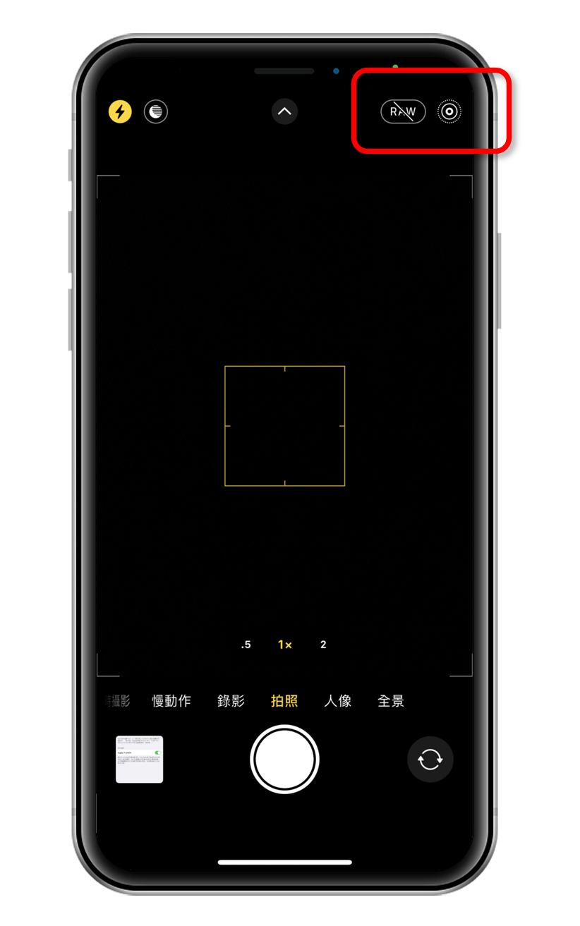 接著進入相機就可以在右上角看到 RAW (Apple ProRAW) 的選項,之後要拍攝只要點選就可以儲存為 Apple ProRAW 格式