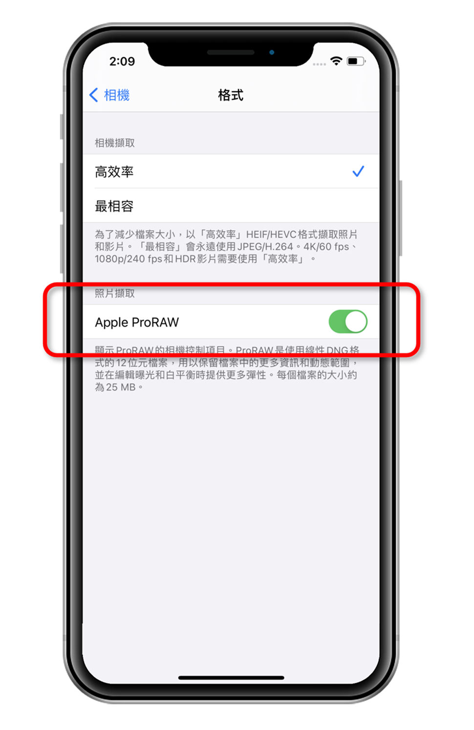 到設定 –> 相機 –> 格式,然後將 Apple ProRAW 的選項開啟