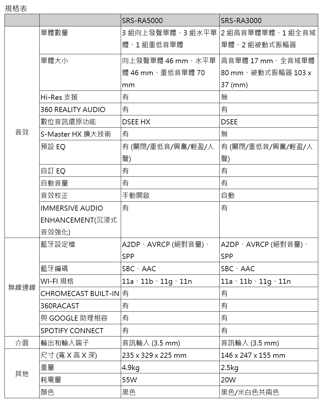 簡約的線條設計搭配細緻的織布材質包覆機身,流線的金屬喇叭更體現高質感的居家生活品味;SRS-RA5000 、 SRS-RA3000 皆相容 Sony 獨家 360 Reality Audio音檔,可將特殊 3D 空間定位編碼的音檔,以更具臨場感的效果傳遞重現;同步支援 Sony | Music Center 應用程式藉由智慧手機即可輕鬆設定播放清單、調整等化器等客製個人聆聽偏好,此外,還有「自動音量調節功能」可隨時分析音軌確保輸出音量的一致性,保持聆聽的流暢體驗。主機除了支援無線藍牙穩定連結,也可透過 NFC 一觸即連 (僅 SRS-RA5000) 和 Wi-Fi 傳輸播放音樂清單,還可啟動與 Google Assistant 相容的裝置,透過語音操控 SRS-RA5000 和 RA3000;此外,兩款揚聲器皆支援 Google Home 應用程式 Mutil-room功能,可串聯相容喇叭擴充音場效果;Sony 旗艦無線揚聲器 SRS-RA5000 、 SRS-RA3000 具備便利的智慧運用設計,整合輕鬆操控的居家聆聽新提案。