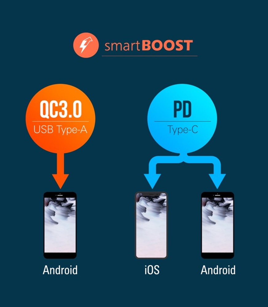 QP70 除了小巧、快速、方便、美型之外,些很注意安全,它的核心技術 smartSENSE 可以自動偵測終端裝置所需最大充電功率,高效安全的完成充電,不用擔心過充;而 smartBOOST 雙引擎快充-PD(Power Dwlivery) & QC 3.0,能為各種行動裝置快速充電。