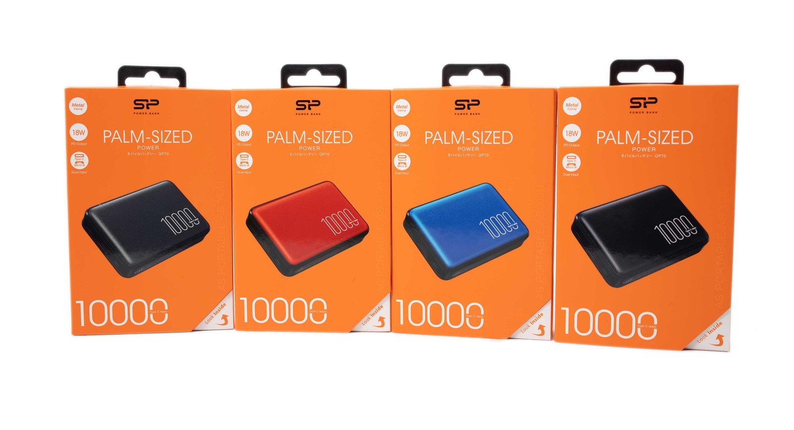 外盒上清楚寫了商品特點,金屬外殼耐用有質感、支援 18W 快充跟支援 Type-C 跟 Micro-B 接頭,還有 QP70 本人玉照。