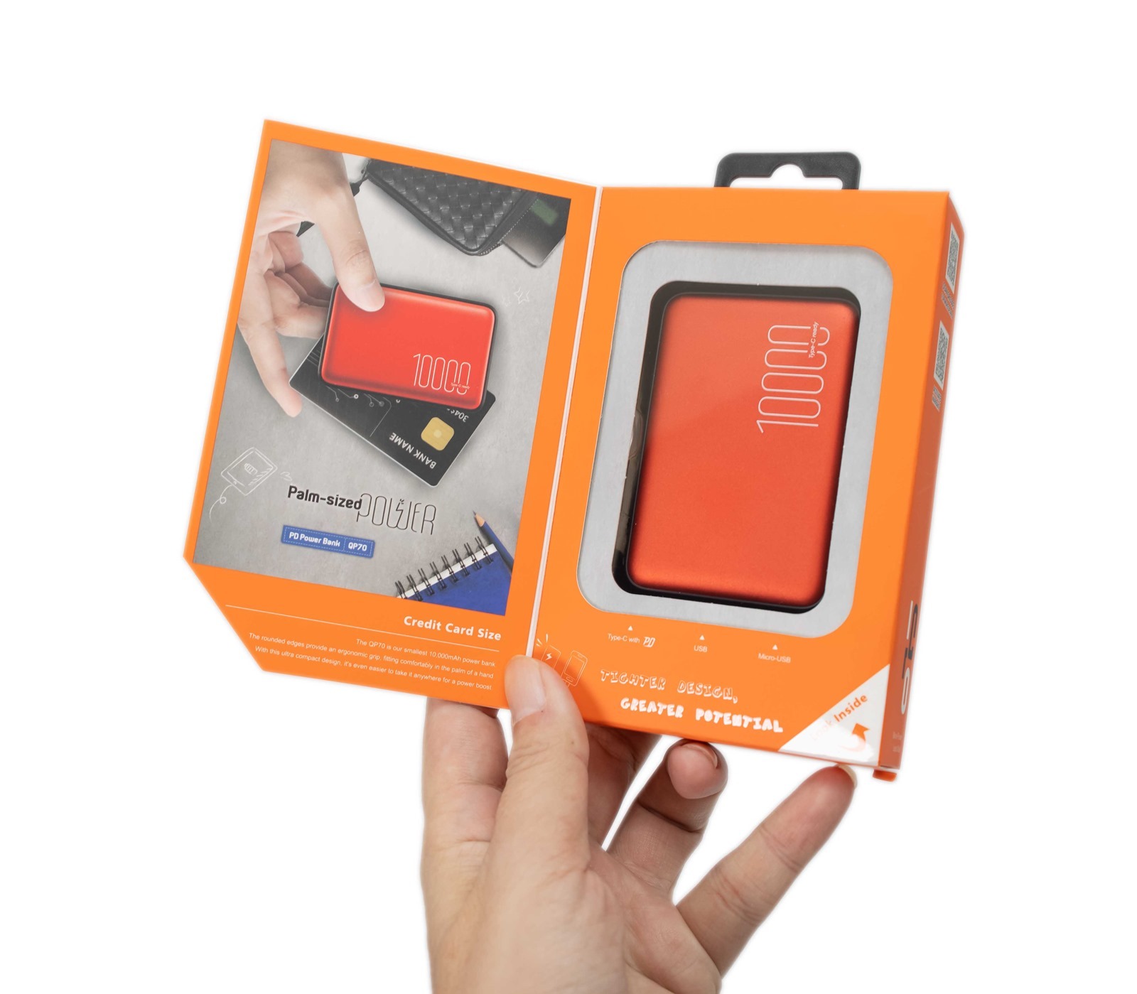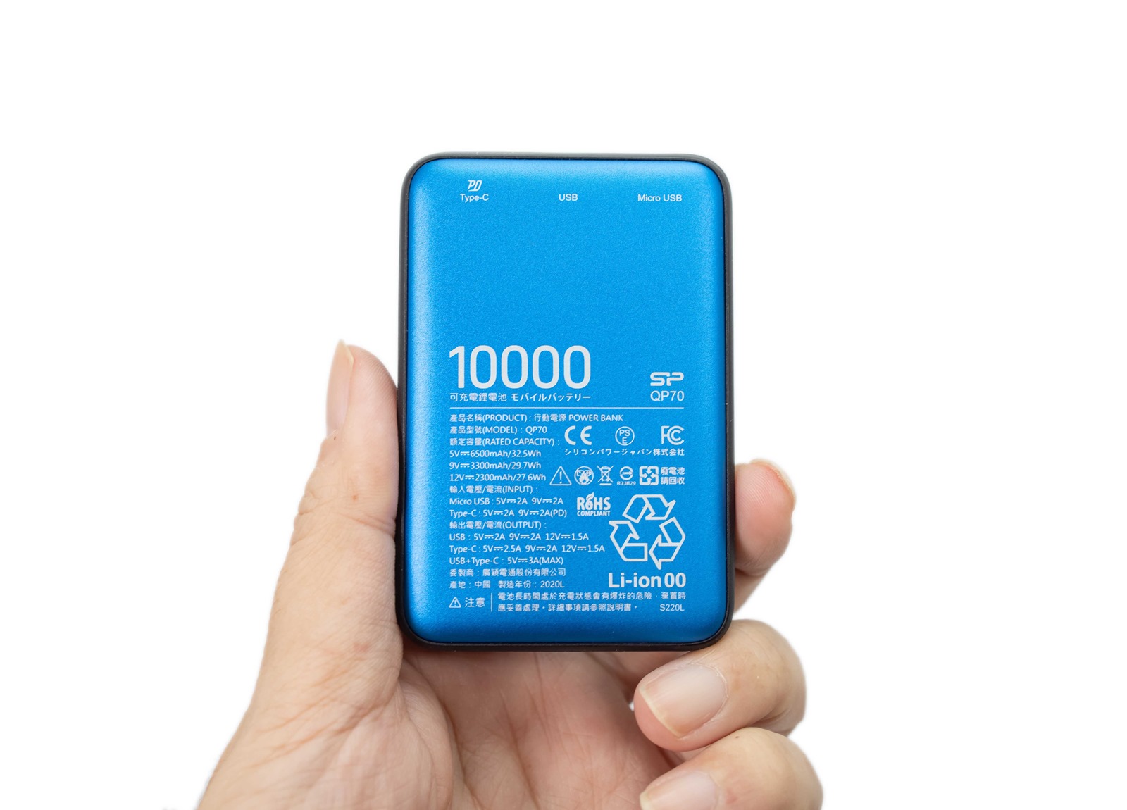 QP70 只有信用卡大小,玲瓏精緻,堪稱是 SP 廣穎電通迄今推出最迷你的 10,000mAh 行動電源,也因為體型,不管是男生女生,都可以簡單一手拿起手機跟 QP70,不用再面對充電危機時還手忙腳亂的窘境,而且重量僅僅只有 166 克!
