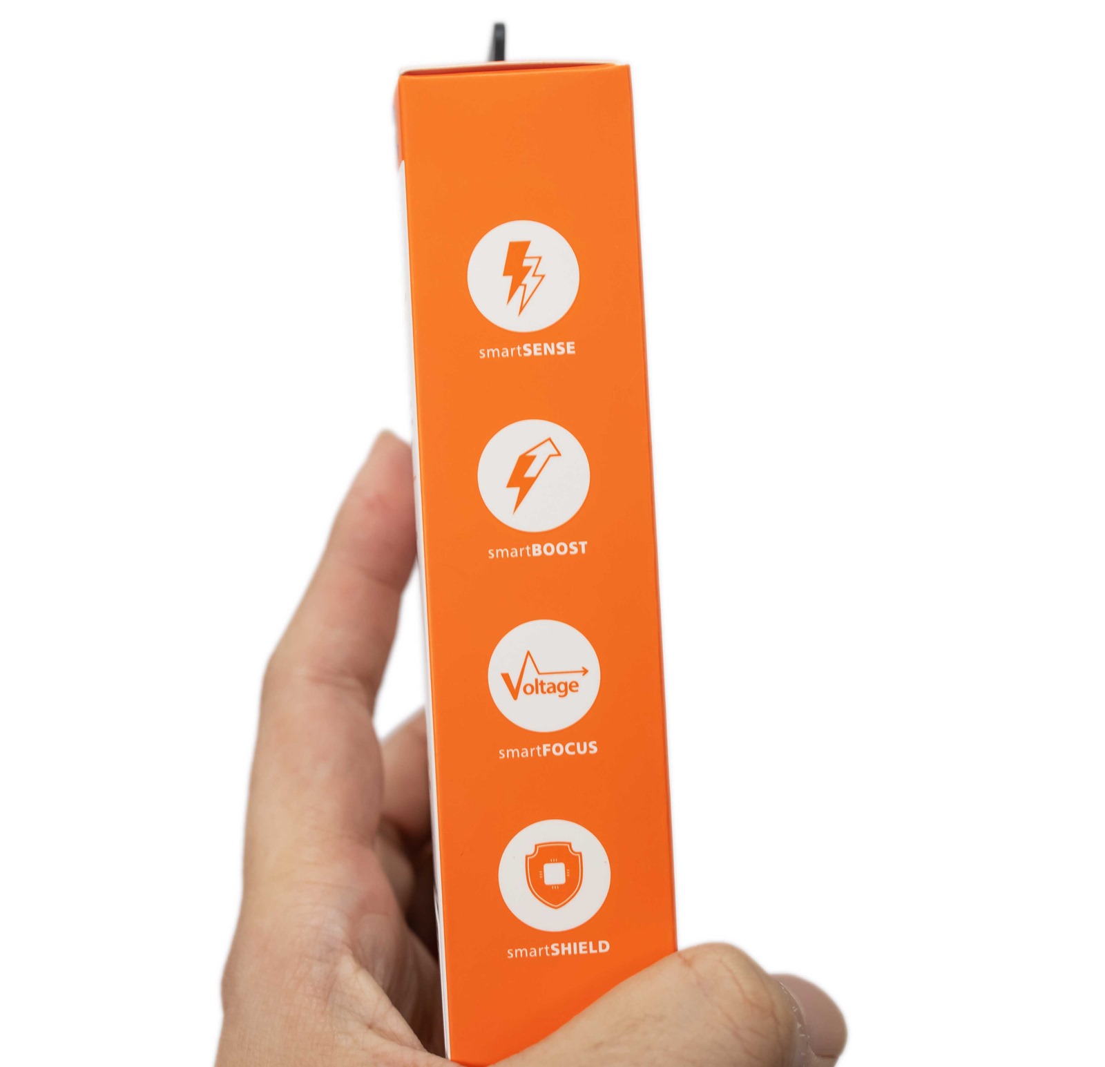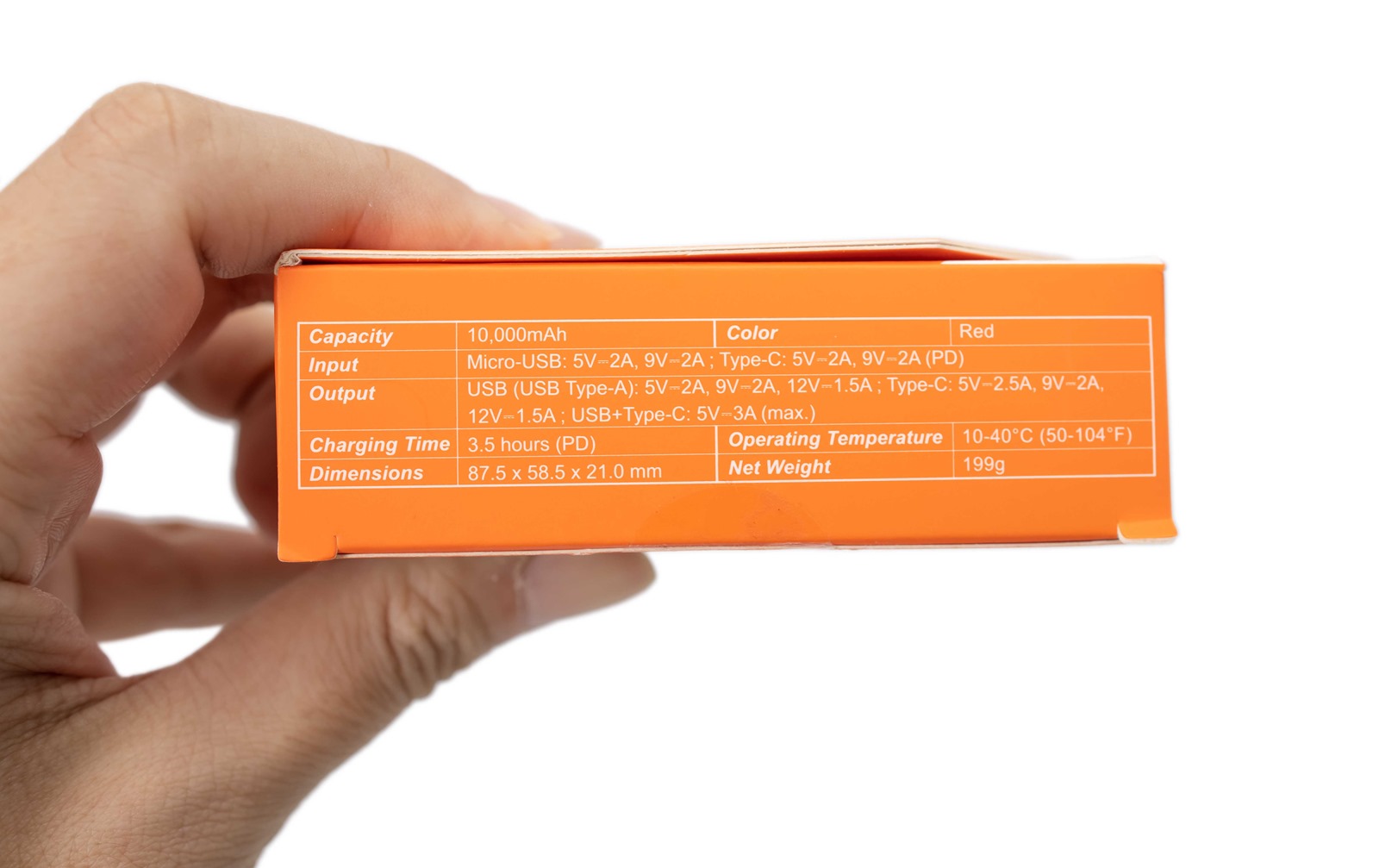 側面也一樣是搶眼的鮮豔橘色底,配上挖白的圓圈簡單介紹 QP70 的智慧核心技術,像是雙引擎快充、偵測裝置所需最大充電功率等等。