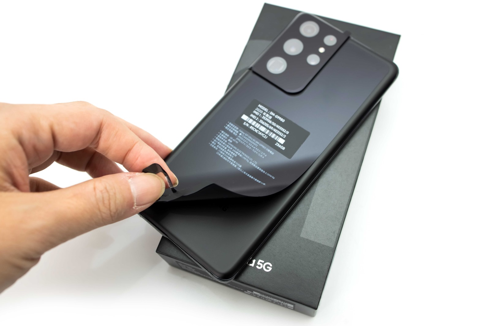 開箱後就可以直接看到手機了,這一次 Galaxy S21 Ultra 手機正面與背面『都有』出廠保護膜,和以往有些不同