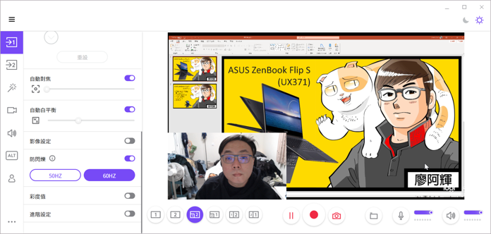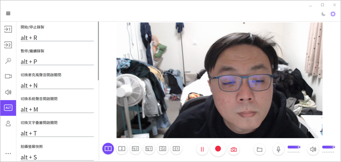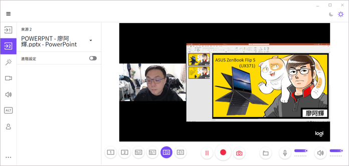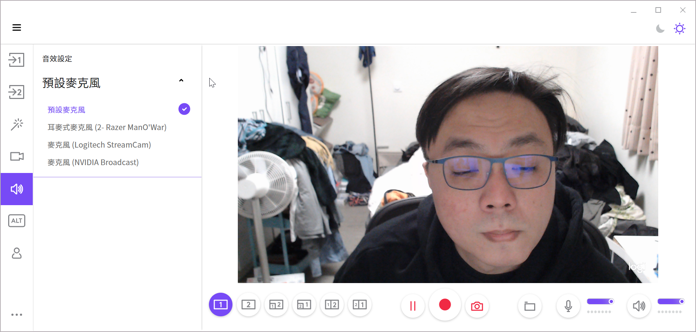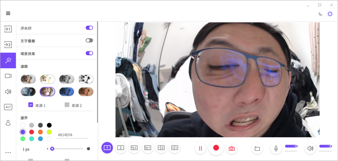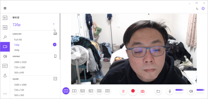 下排開始錄影或拍照的紅色按鈕左邊,是可以設定多重畫面,不只可以切割,還可以選擇子母畫面或是各種排列,能符合不同功用,如視訊會議或是實況玩遊戲,需要的畫面比例就大不相同。