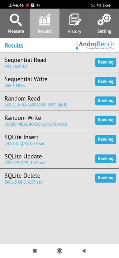 其實除了 CPU 處理器與記憶體,內建儲存空間的讀取/寫入速度也非常影響到日常使用的順暢度,這裡使用 AndroBench 實測讀寫速度,測得的結果為讀取 491 MB/sec MB,寫入為 266 MB/sec