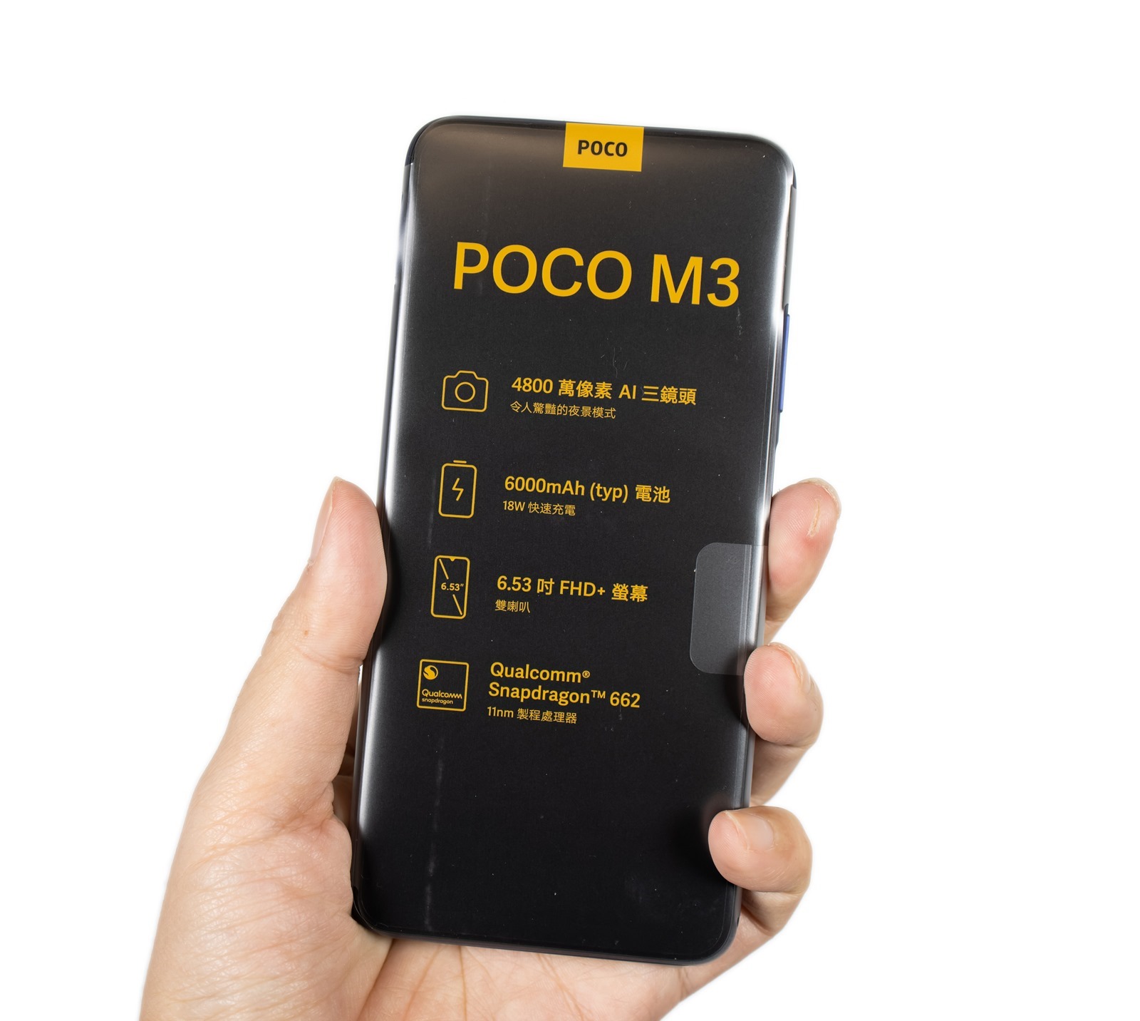 拿出主角 POCO M3,出廠的機器保護外膜上也印了 POCO M3 的許多特點,在這價位過去可以說是不可能出現的 4800 萬像素 AI 三鏡頭、驚人的超大 6000mAh 電池、採用 6.53 吋 FHD+解析度螢幕,使用中階旗艦才會出現的高通 S662 處理器等等….