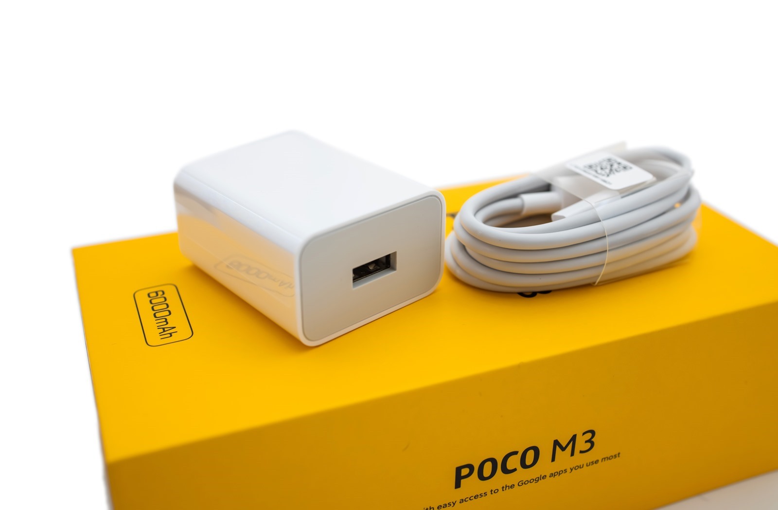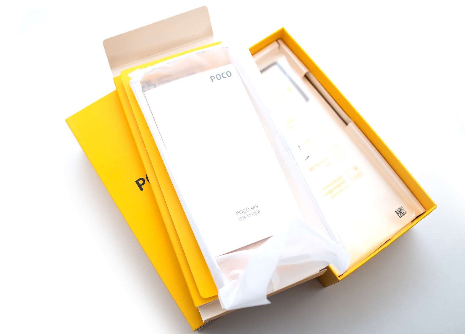 開箱就先來看看配件吧!POCO M3 包裝盒採用黃色盒子黑色文字的風格,包裝可以說附上非常完整的配件,直接標配 22.5W 快充充電器、 USB C 充電傳輸線、軟質的透明保護殼。