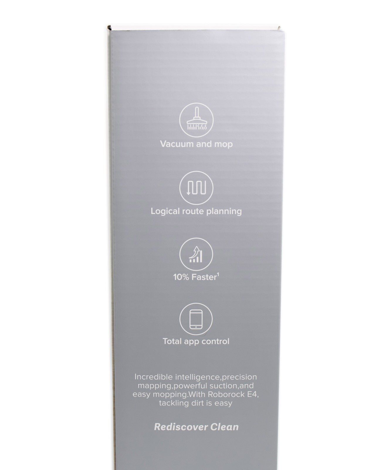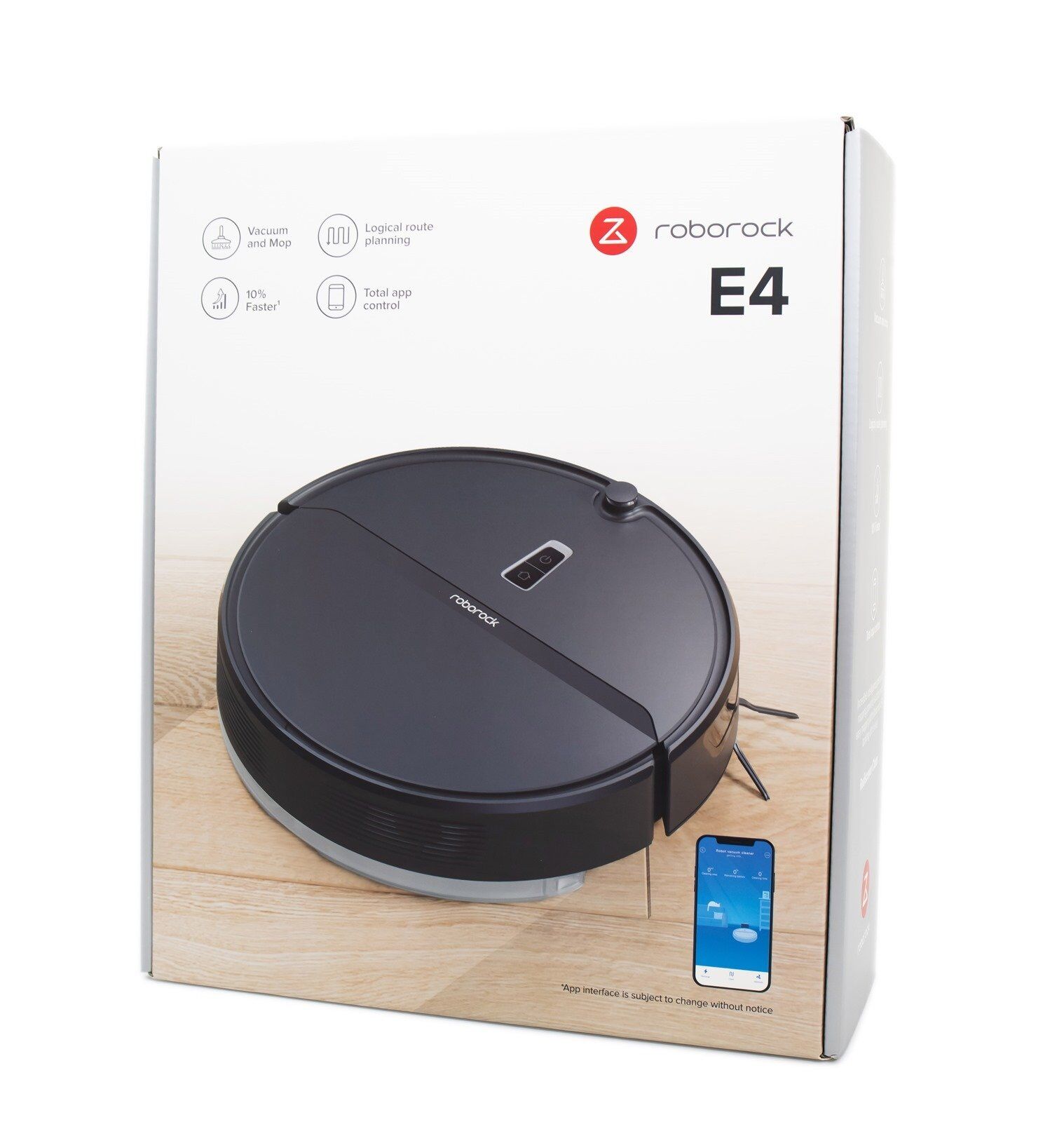 ROBOROCK E4 這次主打的功能是兼具吸地與拖地功能、邏輯清潔路徑功能規劃、清潔速度提升 10% 和完全可透過手機 APP 管理打掃工作,這點從這次包裝正面右下角的部份多放了一隻手機呈現 APP 畫面就能察覺端倪。