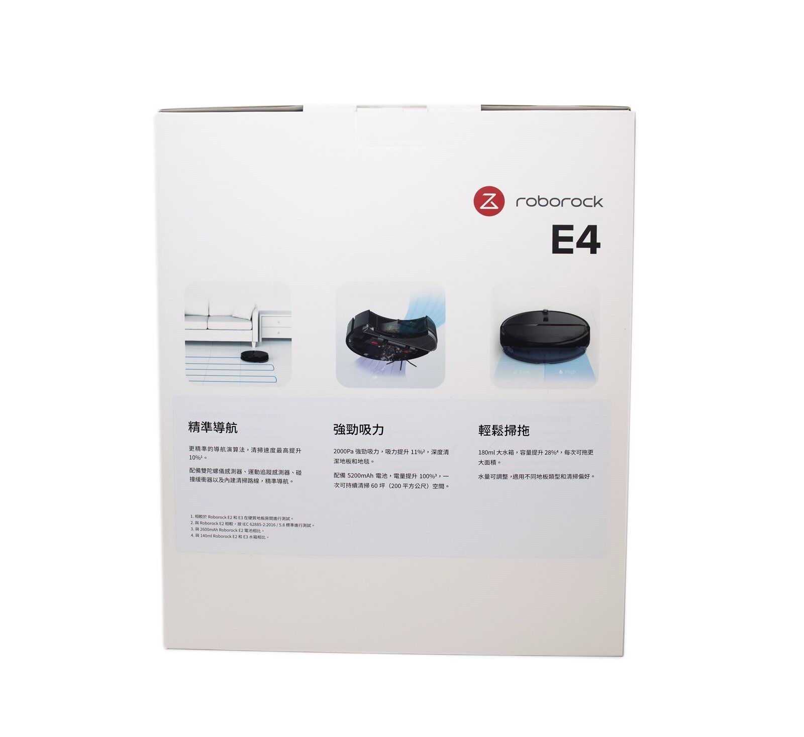 盒身背面的部份則是標示的也是 ROBOROCK E4 的特色功能,像是相較於前代功能提供了更精準的導航功能、以及更強勁吸力與更持久的電力,還有更大的水箱提供更長使用範圍可以更輕鬆掃拖的特色。