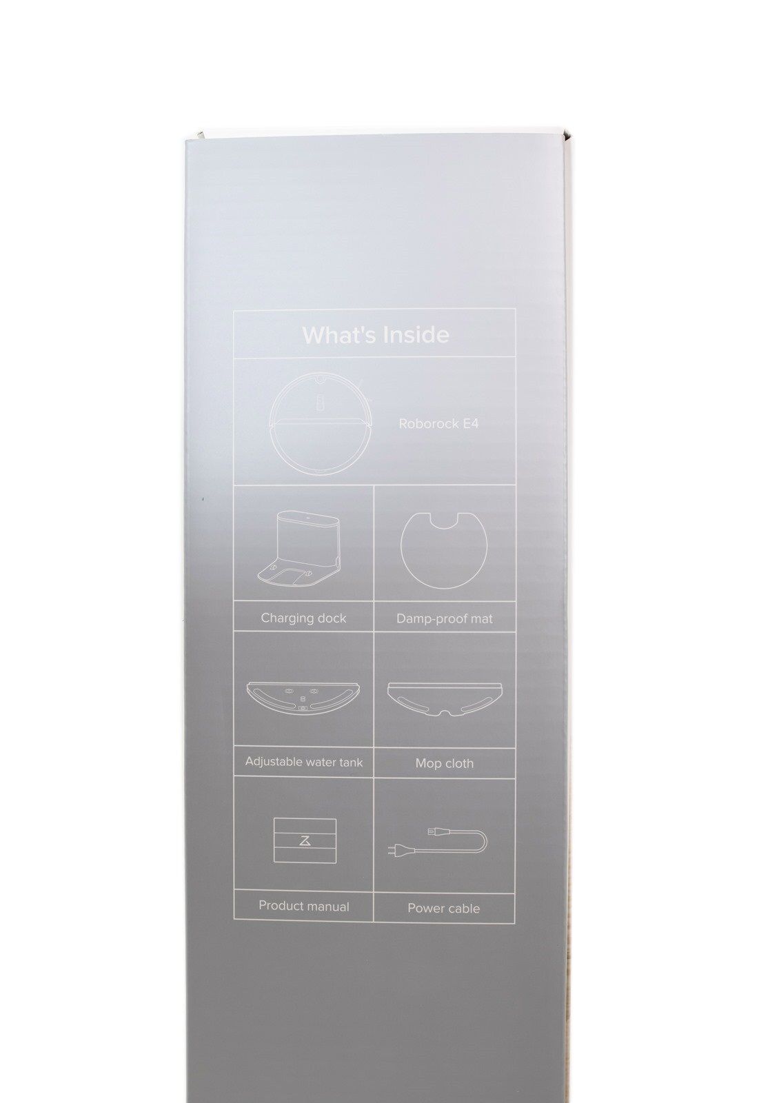 盒身雙側分別標示的是 ROBOROCK E4 的盒裝內容物的品項、另一側則是再次強調這次 ROBOROCK E4 的主打功能,詳細的內容我們就在後面段落做更多的介紹。