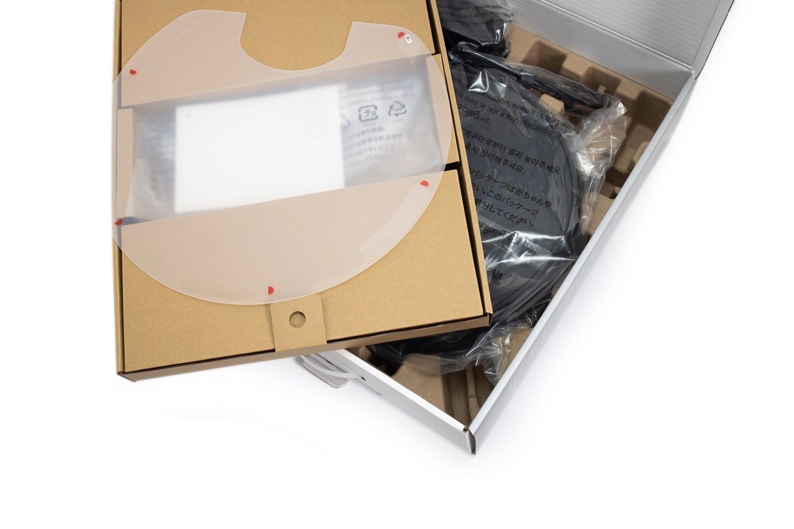 盒裝同樣也是採上開的設計,部份拖地的配件另外有一個小紙箱在內層做收納,Roborock E4 的主機本體則在更下方使用透明袋和瓦愣紙做基本了基本固定,也一樣有附上透明底板防水墊可以用於木質地板基站處安裝避免長時間可能發生的過潮問題。
