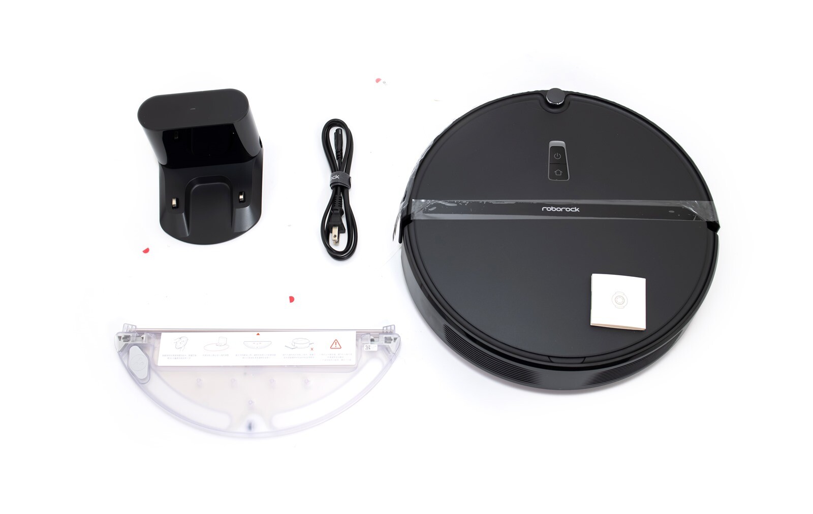 盒裝的內容物共有掃地機器人本體、充電座、電源線、防水墊、拖布與可調節水箱和四個固定拖地抹布用的備品配件。