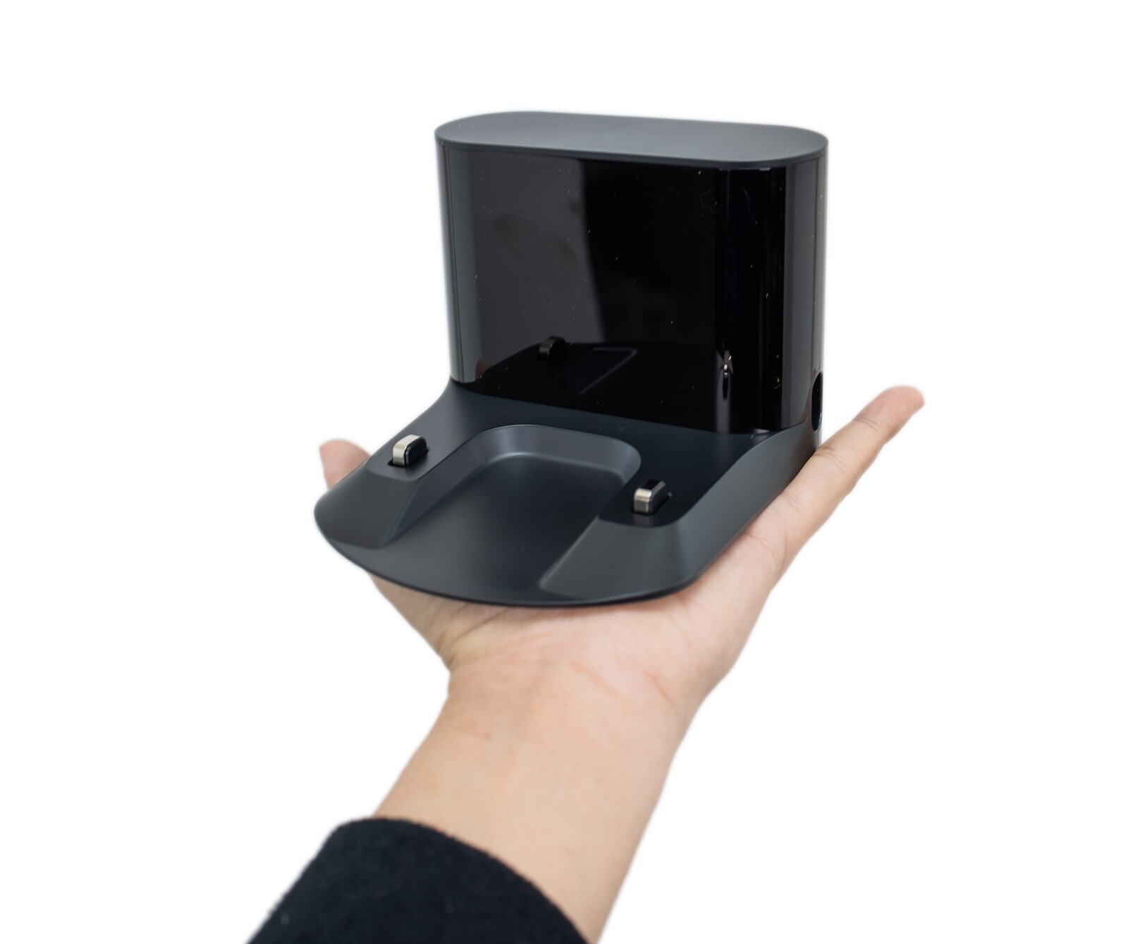 Roborock E4 的充電底座和主機本體都一樣是黑色的外觀,底座的黑則有兩個鏡面與霧面的黑色材質做結合,電源連接孔在底座右側,使用的是八字電源線,不需要特別做任何固定,只要挑好一塊家中要用來放掃地機器人的風水寶地,把電插上就能讓它開始充電準備等工作了。