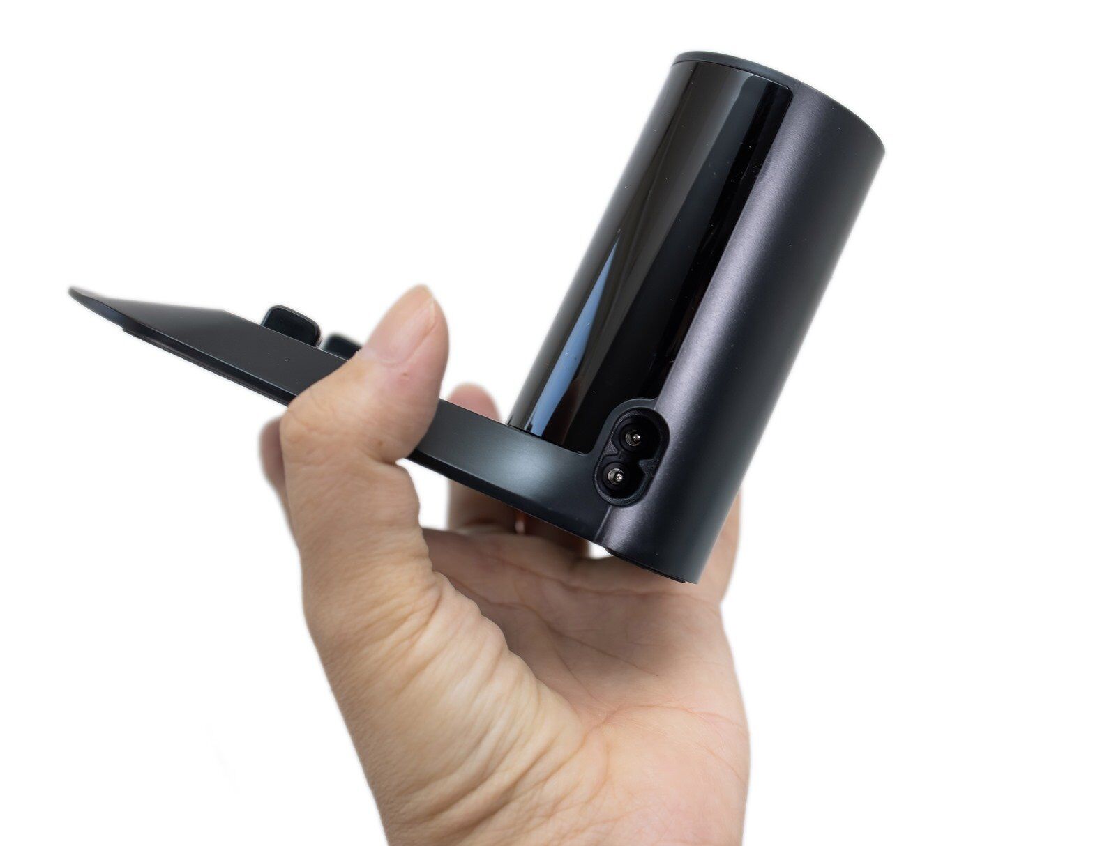 卡扣的位置就是在阿輝大姆指與食指的位置上,向中間按壓後就可以鬆開卡扣。