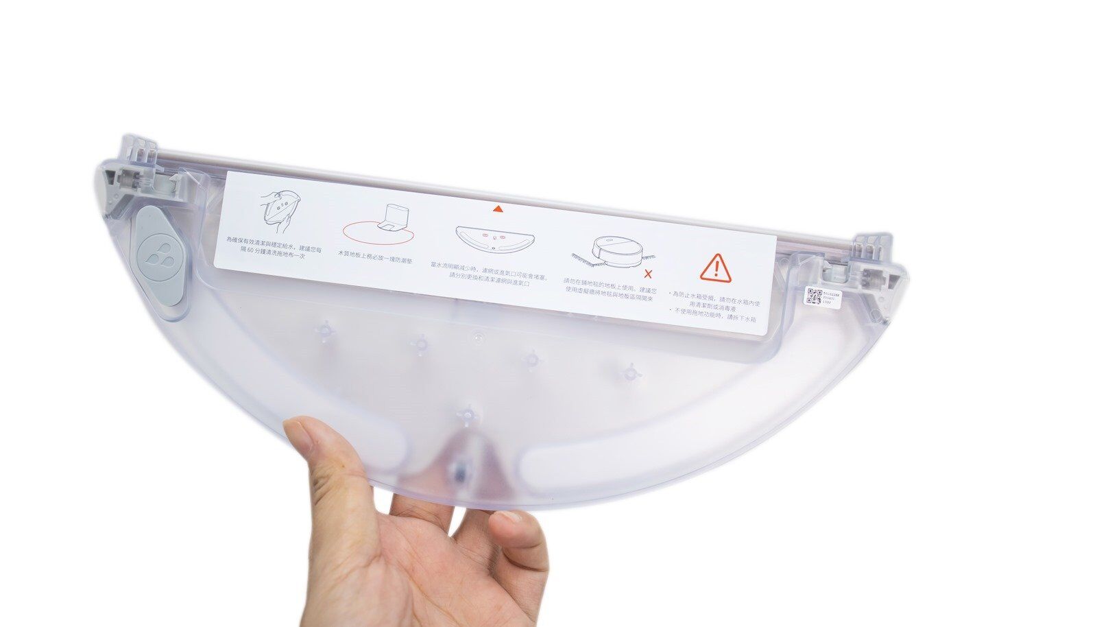 拖地的配件有可調節水箱、換拖地布固定用的配件和防水墊。可調節水箱的外觀是半透明的 PVC 材質,儲水容量有 180ml,和 E2 、 E3 的水箱相比之下多了 40ml 的儲水功能,容量提升了 28%,可以清潔的面積更是大上許多;並且出水量可做調整,可依照家裡不同材質的地板或者是髒污狀況去決定出水量,例如使用在木質地板的時候可以將水量調小一點,讓地板清潔變得輕鬆簡單。