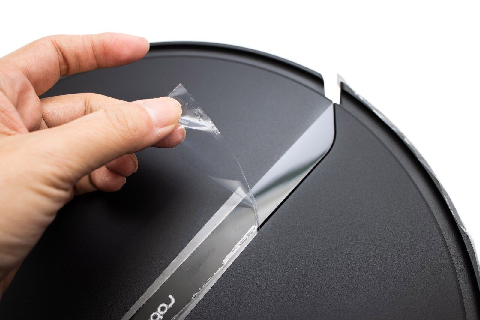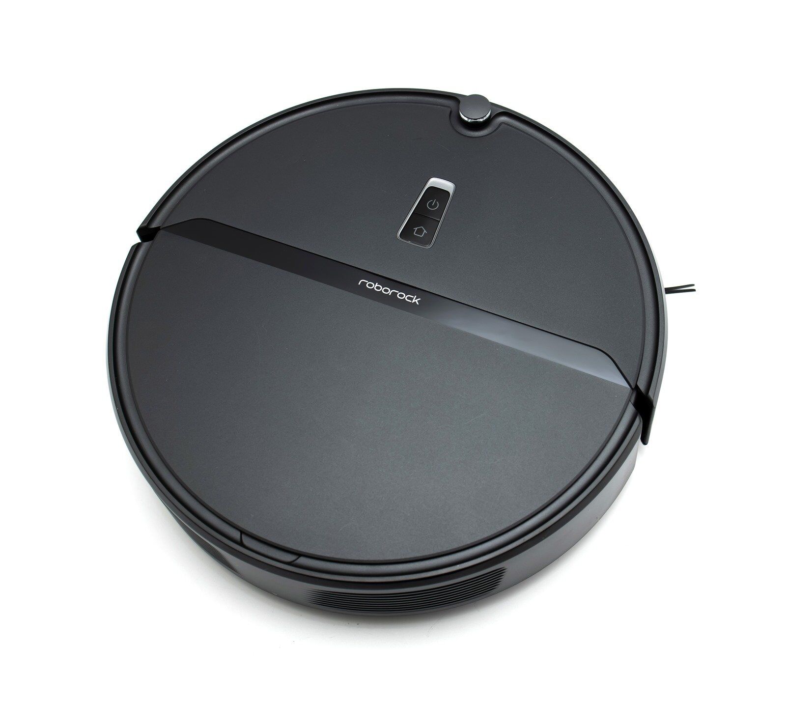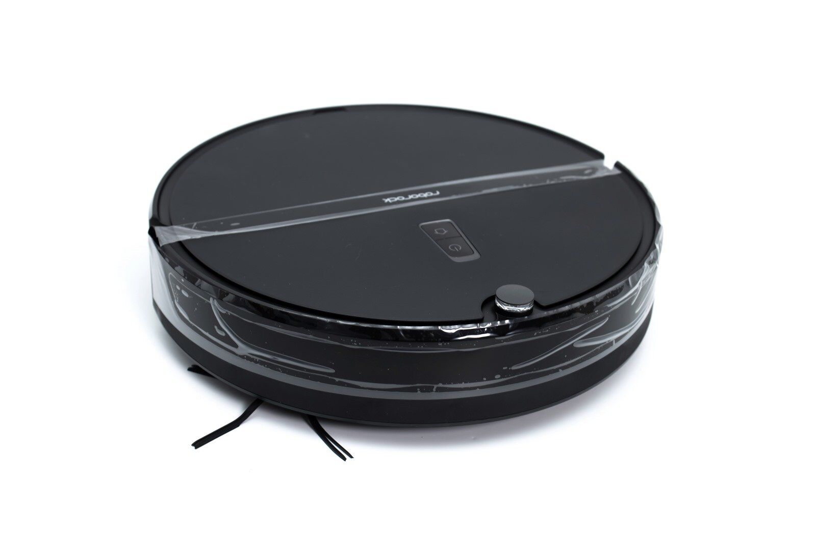 Roborock E4 的的機身是由鏡面黑與霧面黑兩種材質交錯而成,ROBOROCK 的 LOGO 橫印在機身的中央,電源鍵和 HOME 鍵也都一樣在機身的正上方,專利的矽膠刷也已經安裝在機身上。鏡面材質的部份都有用膠條做基本保護不讓它刮傷,阿輝最喜歡這種撕開新玩具的感覺了。