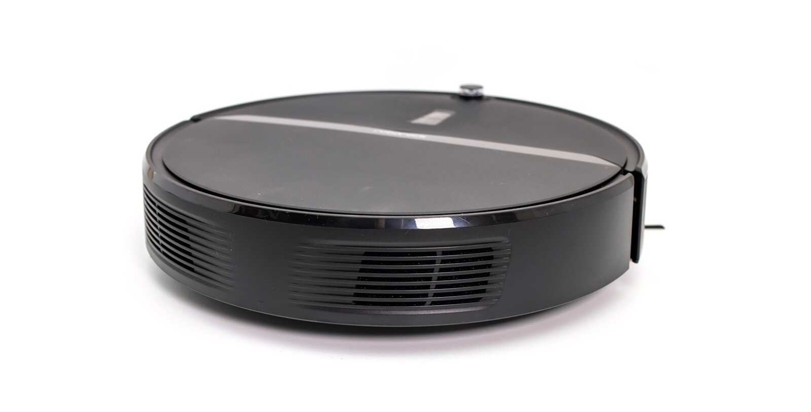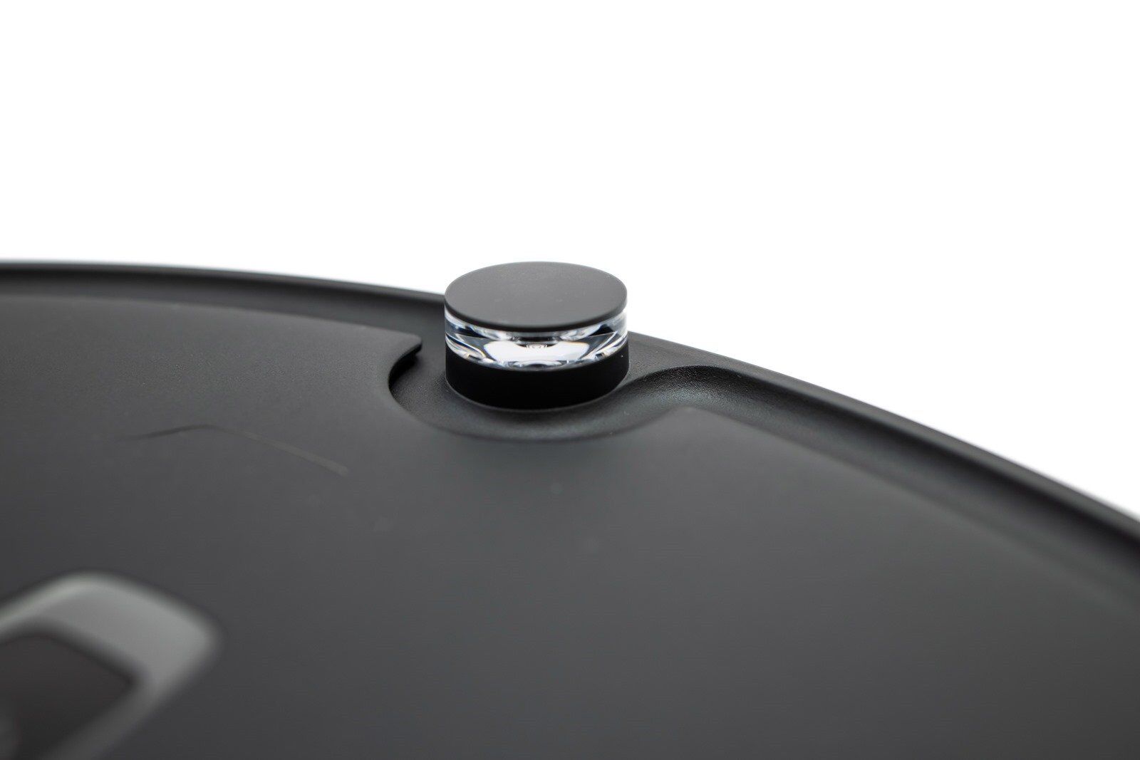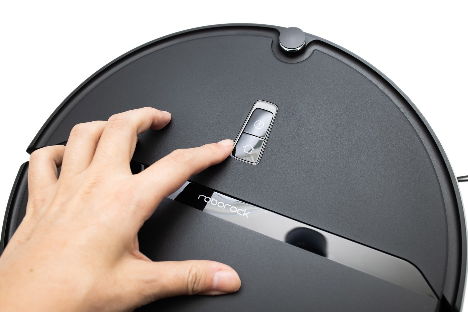 正面上半部的電源鍵和 HOME 鍵則是呈現了稍有指向感的梯形形狀,造型也因此看起來較有設計感。開關鍵的部份按一下可以讓掃地機器人開始吸地工作、長按的話則可以開/關機。電源提示燈也同樣顯示在一樣的位置,顯示白燈時表示電量充足,顯示紅燈的話則表示電量已經低於 20%,充電中或者是啟動使用時是慢速閃爍,顯示閃爍紅燈時則是有狀況需做排除。