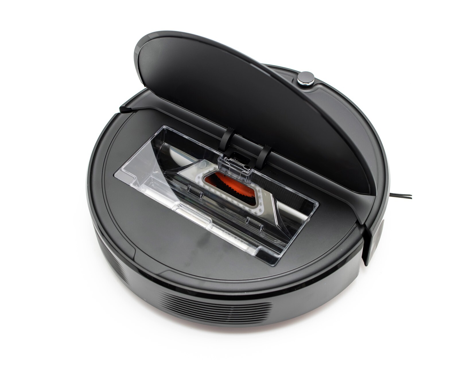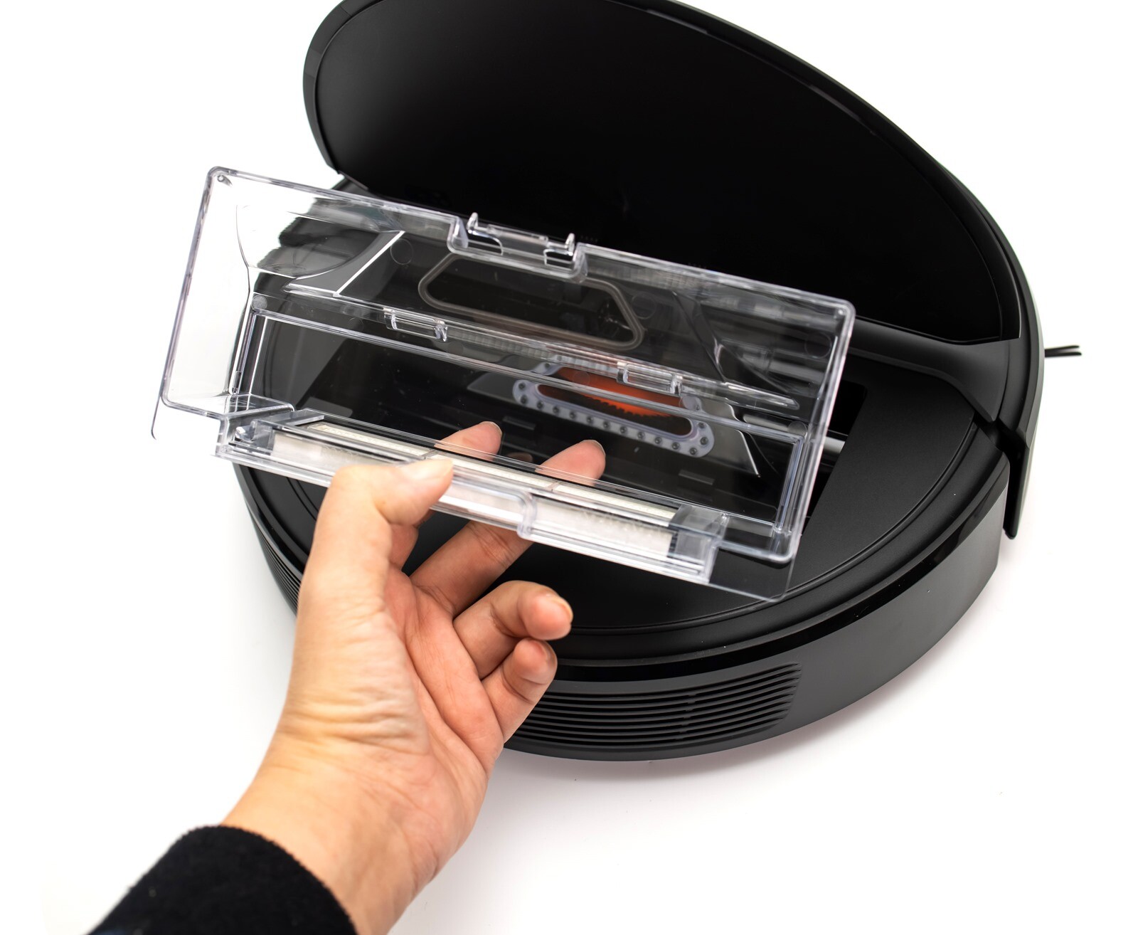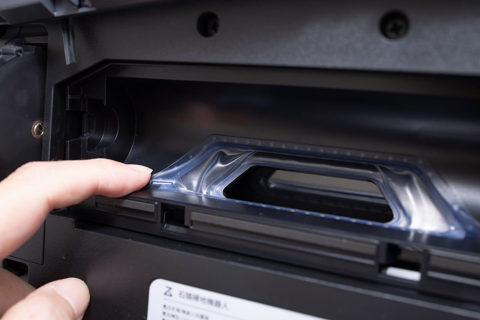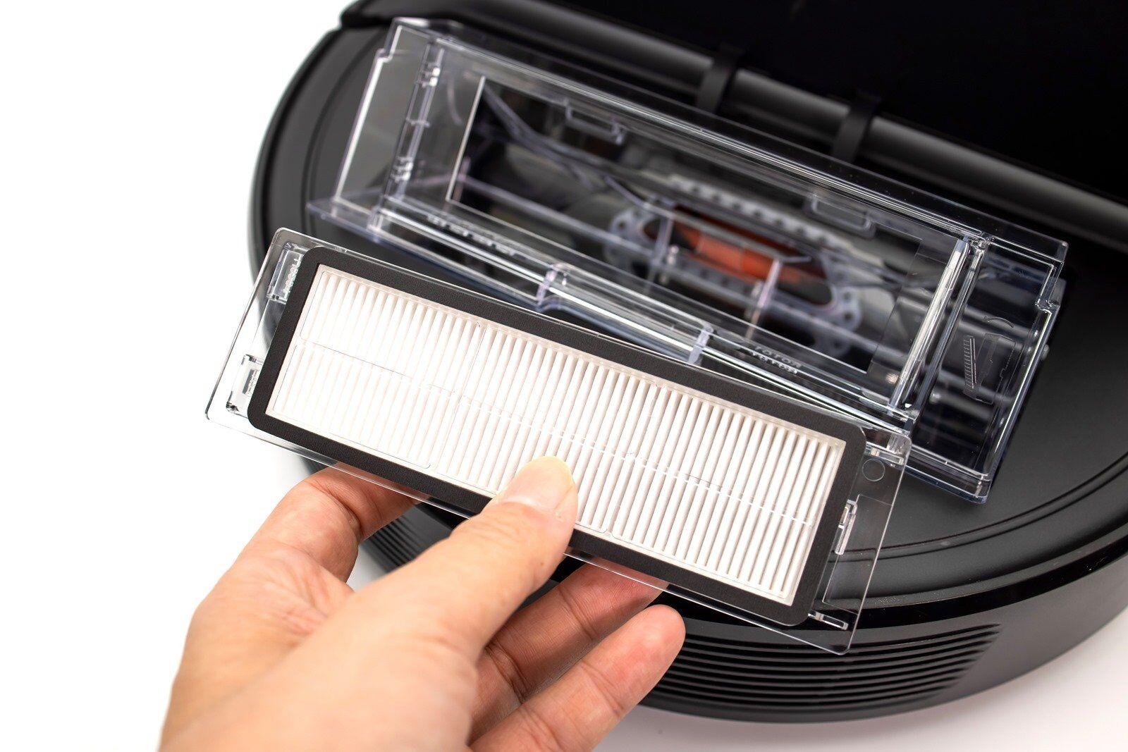 掀蓋口的部份在全向回充感測器的 180 度相對位置上,打開主機上蓋後就能看到 ROBOROCK E4 的集塵盒和濾網的所在位置,按住集塵盒的卡扣就可以將集塵盒取出做清潔。 ROBOROCK E4 的集塵盒有 640ml 大空間,儲存肚量大約可以讓你使用打掃一週才需要清理一次,對於本來就仰賴希望能夠減少打掃時間的使用者來說更是便利性提升加倍。