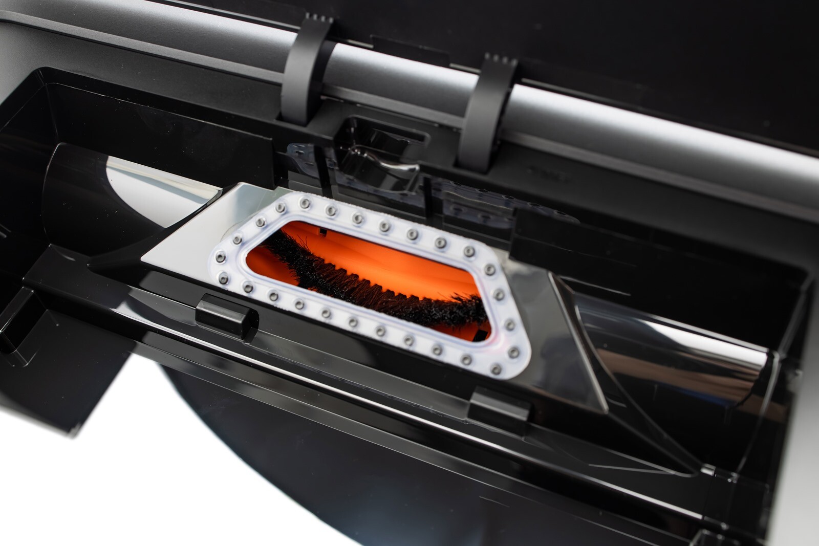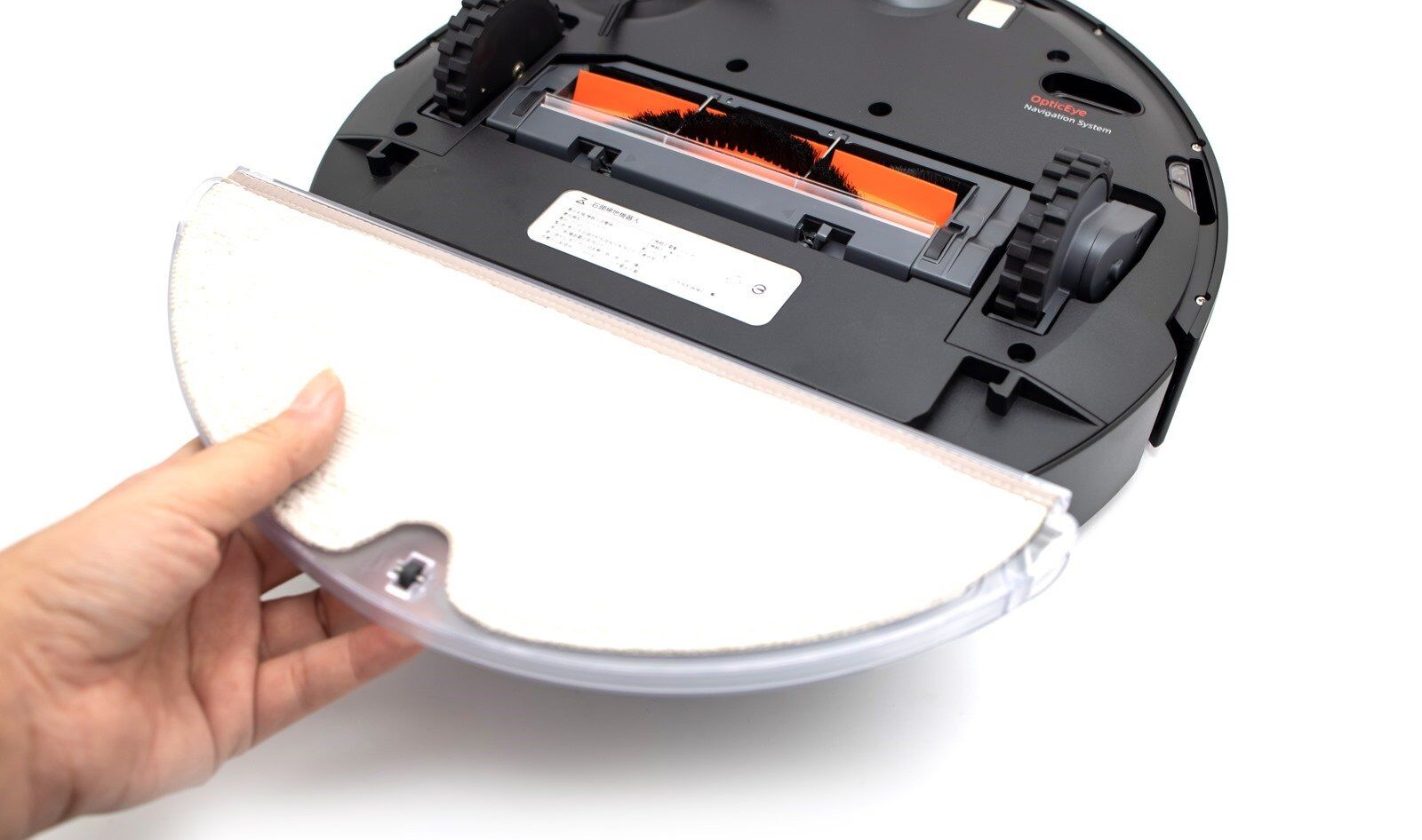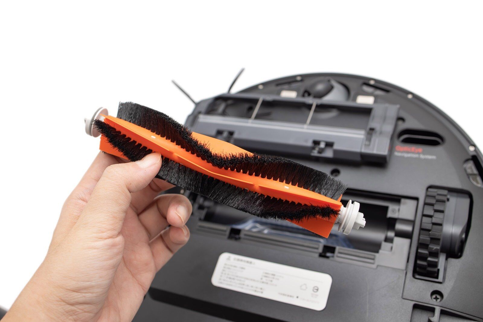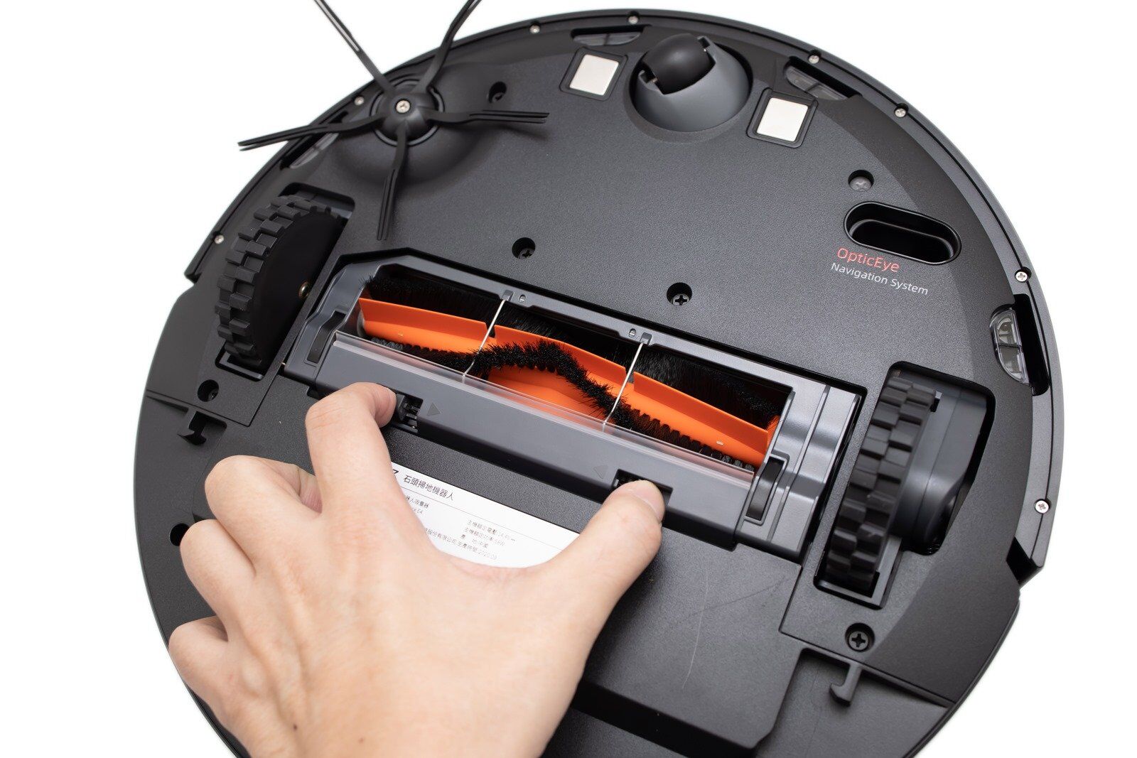 集塵盒底橘黑色的物體就是 ROBOROCK E4 的主刷頭,取出集塵盒後也可以從這邊簡單目視主刷頭的使用髒污狀況,如果看起來有很多毛髮或者是需要清潔的時候,就需要將 ROBOROCK E4 翻轉過來,從底部壓下卡扣後將主刷頭取出。