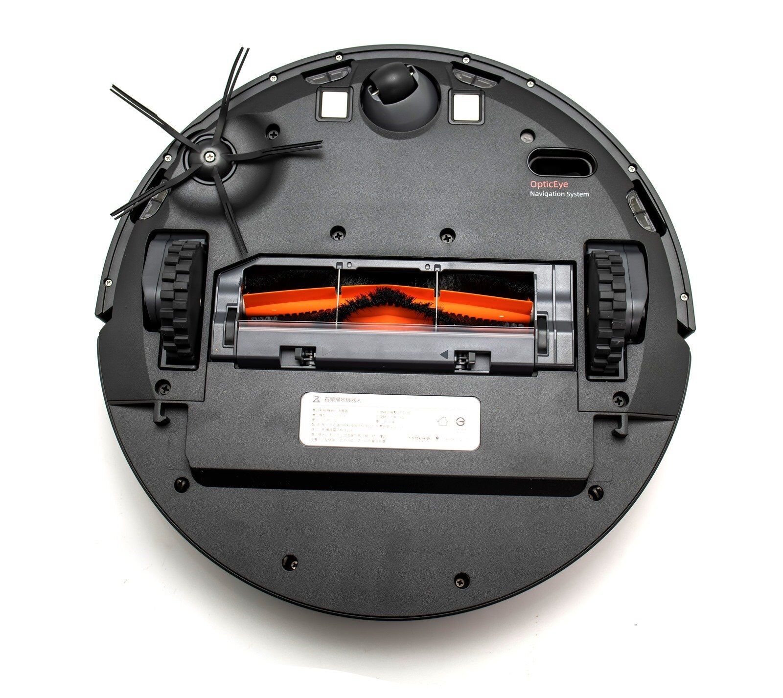 Roborock E4 的底部配有四個懸崖感測器分佈在機器的前半部,並配有一個五爪的邊刷,中央前方的是萬向輪,萬向輪兩側的小方框就是 Roborock E4 的充電觸點;畫面右邊一條長橢圓形狀的則是 Roborock E4 的運動追蹤感測器。中央兩旁的主輪,不只能有平移掃地機器人的功能,同時也具有 2CM 的越障能力,一般的電線或者是門檻都能輕鬆跨越,自行脫困繼續打掃沒問題。