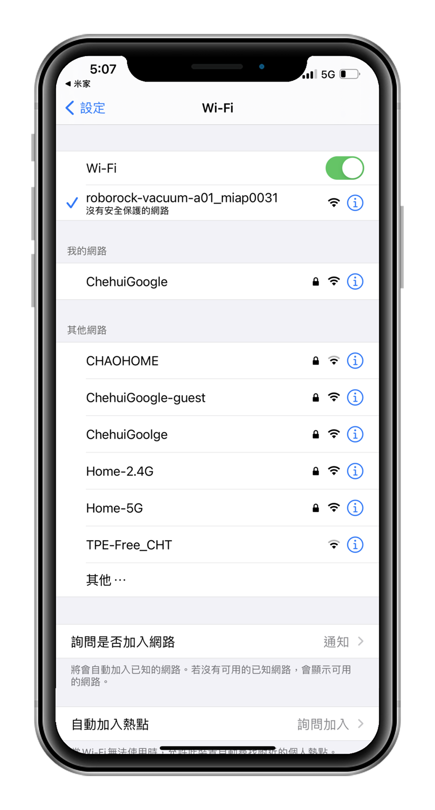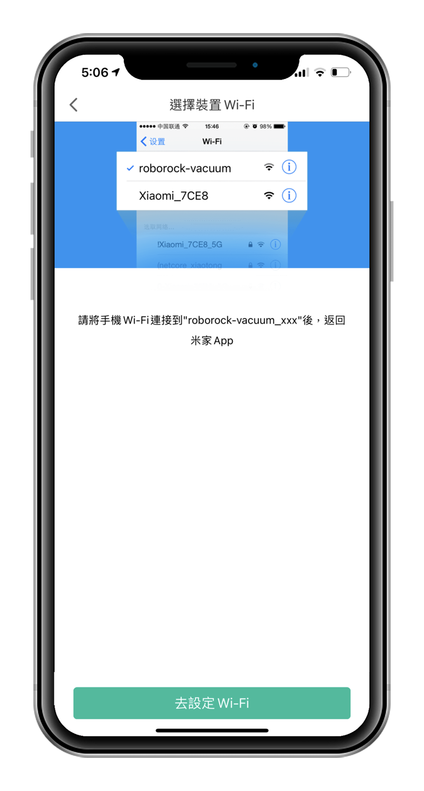 依循畫面指示進到 WIFI 設定頁裡選取和 roborock-vacuum-a01_miap0031 進行連接,並將手機盡量靠近掃地機器人,讓配對連接可以更容易成功。