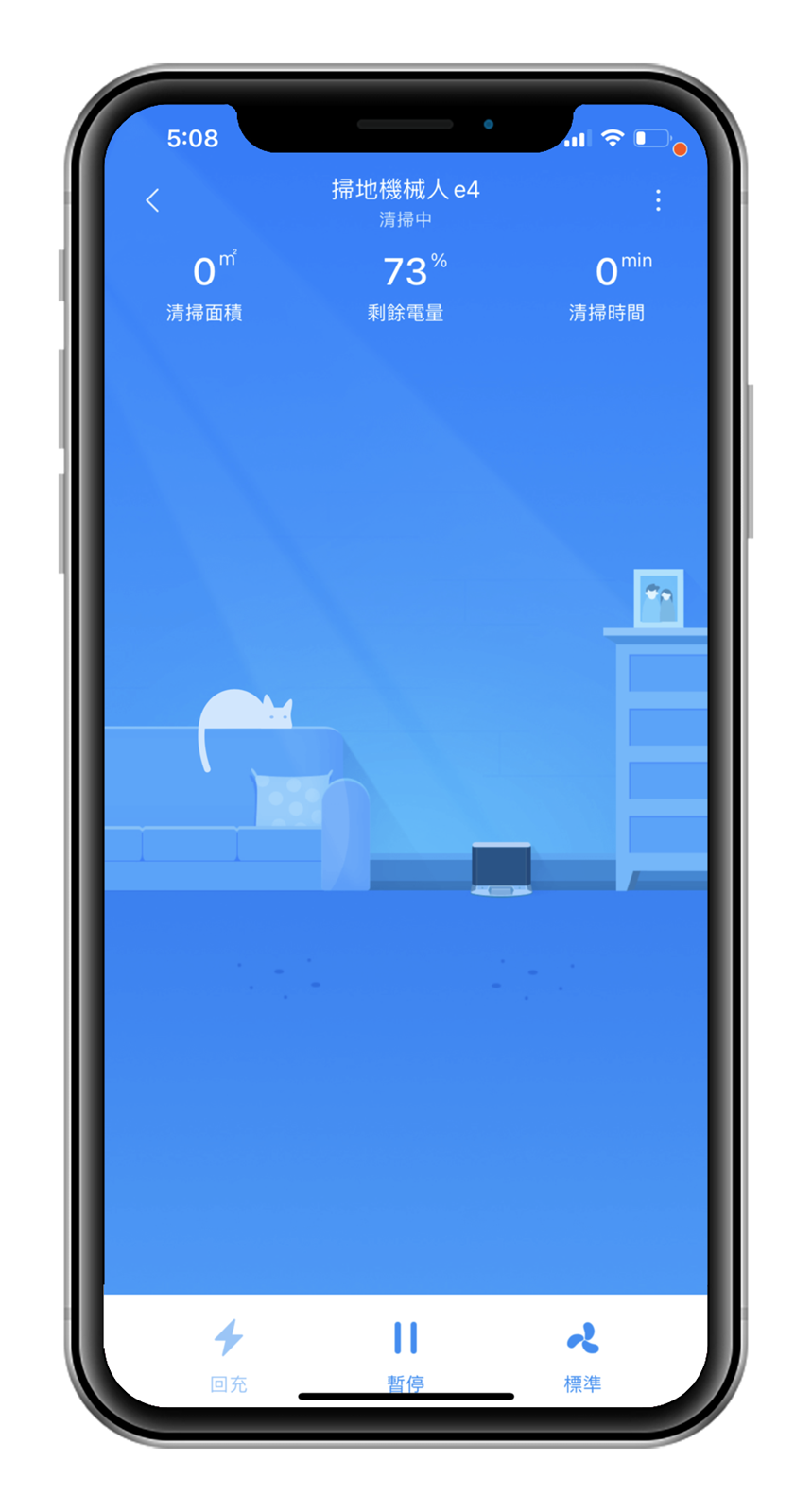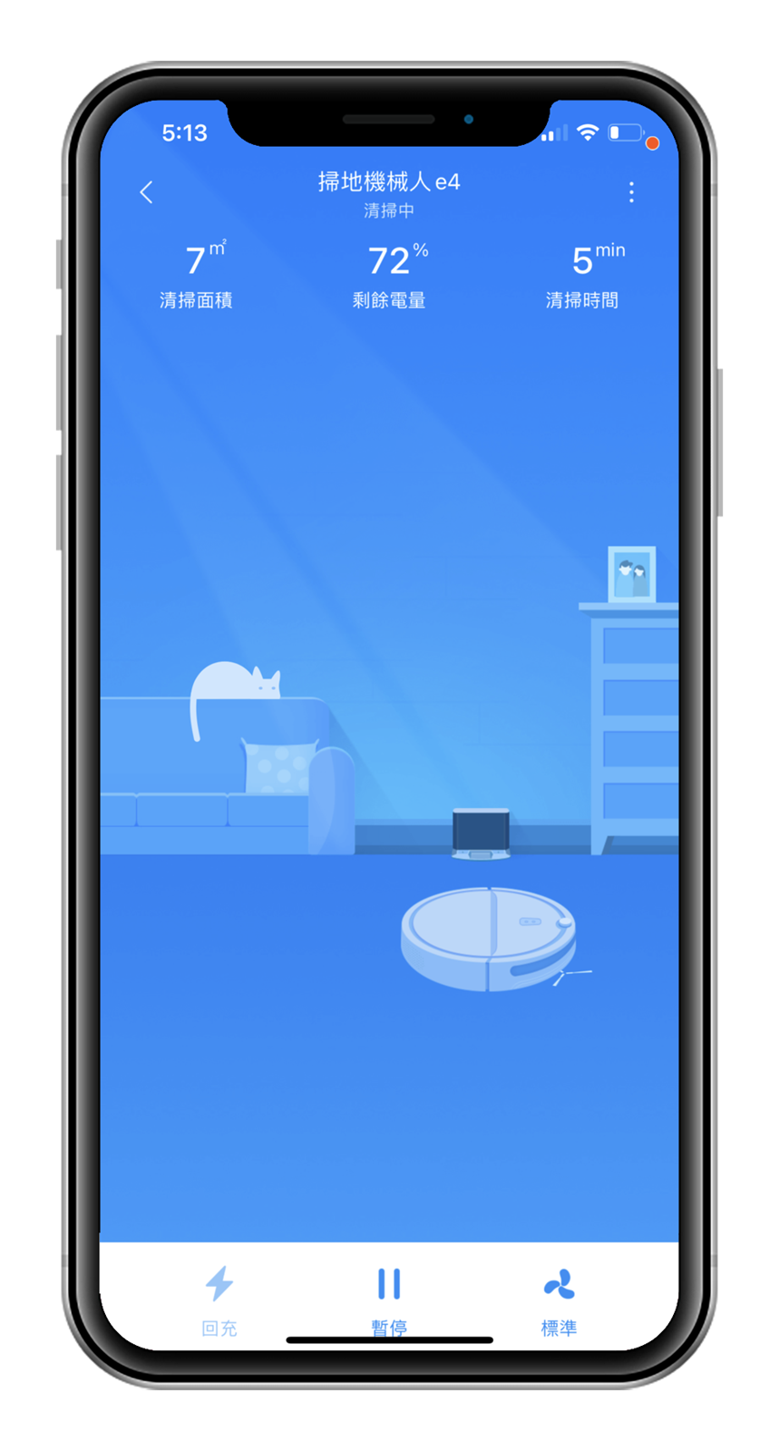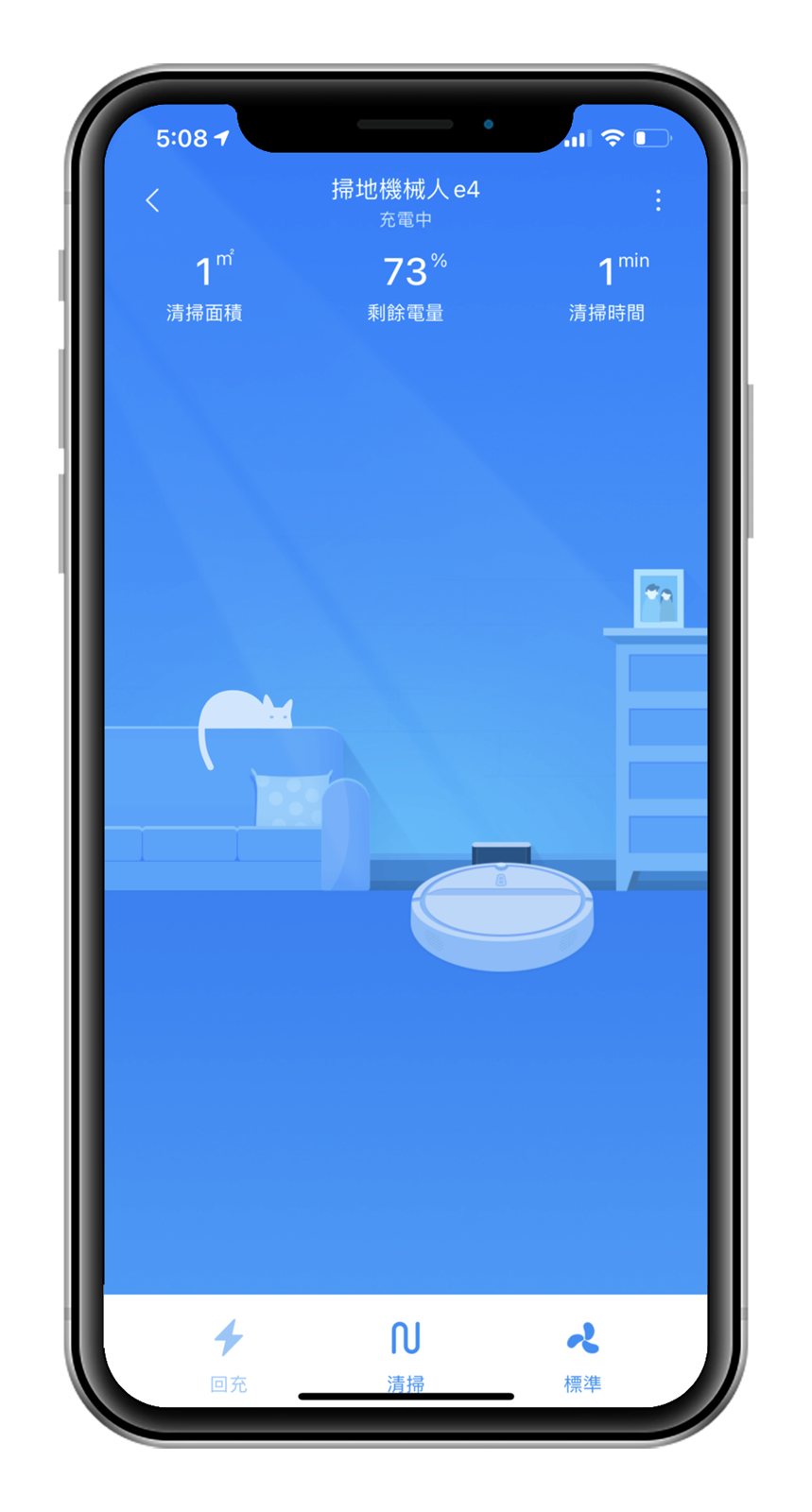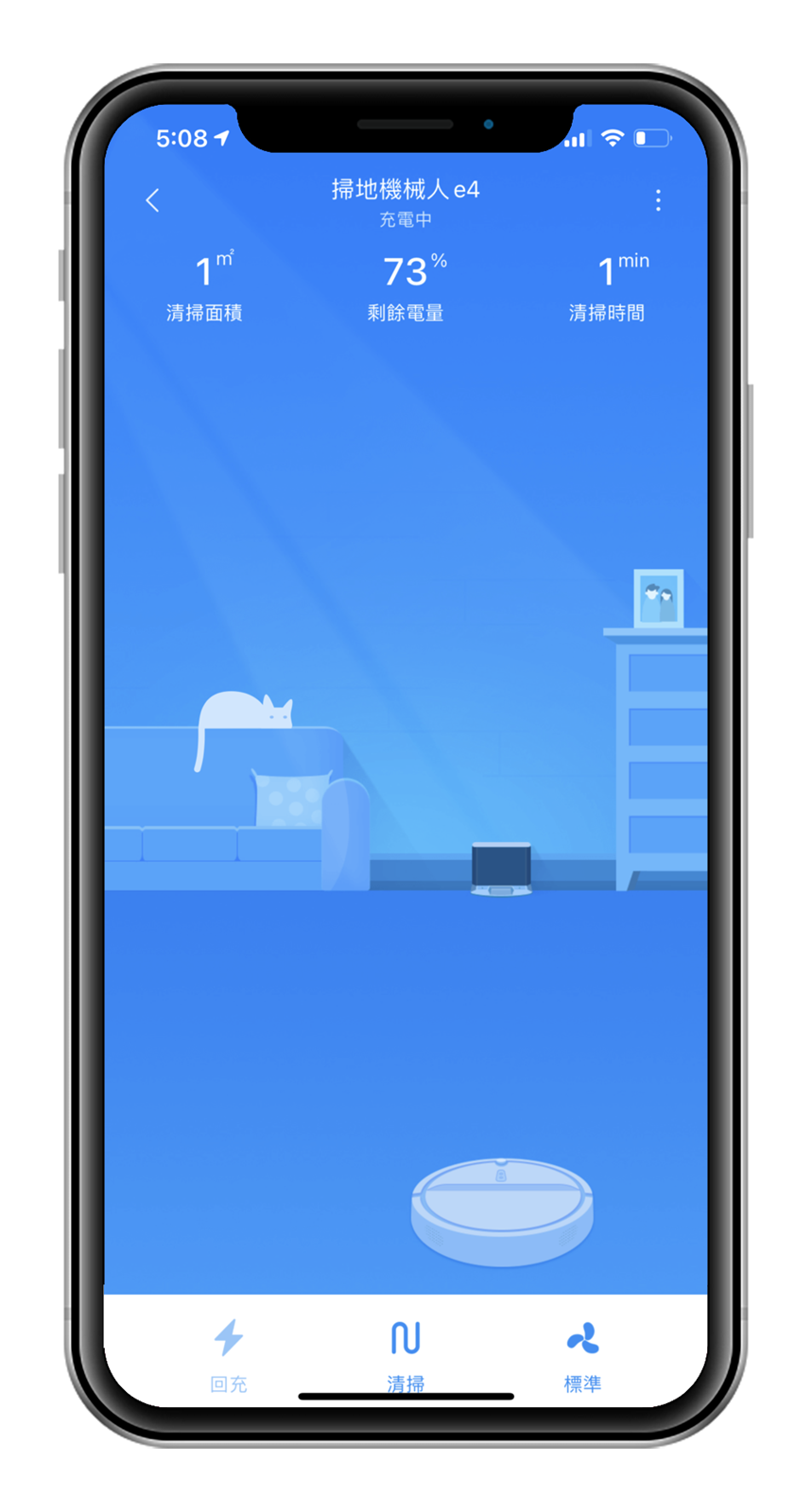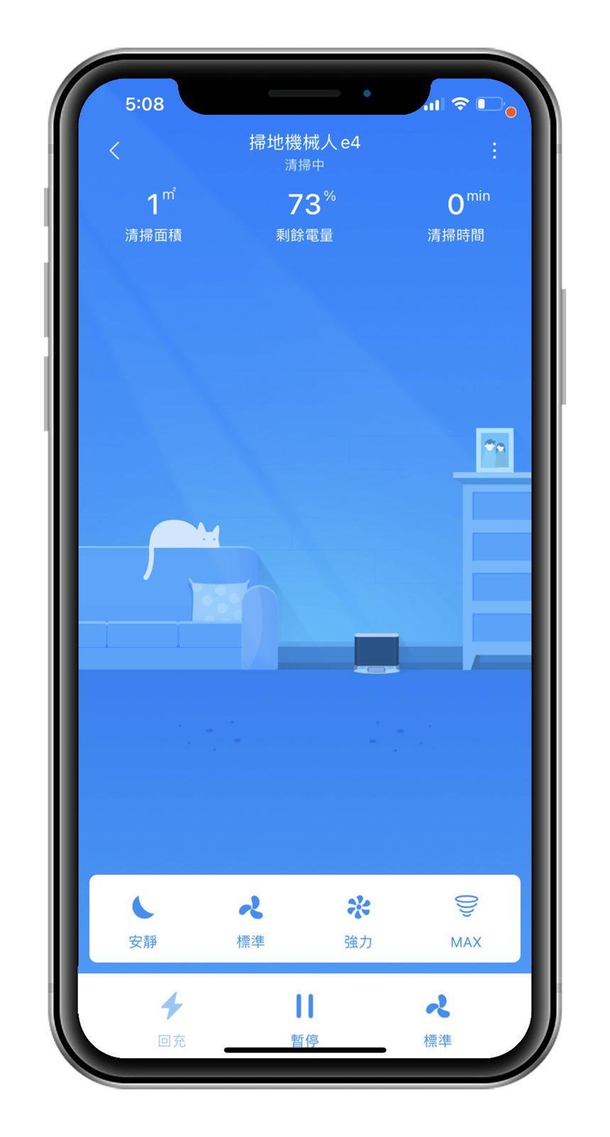 APP 的界面相當可愛,一定是因為知道阿輝是個養貓人所以出現了貓咪 (誤),當然這個畫面不只是為了讓你看可愛,上面還放置了許多你可以了解掃地機器人工作狀態的訊息;界面上方可以看見 E4 目前是在清潔中還是充電中,也能看見目前的剩餘電量和已清掃面積及它工作了多久的時間。