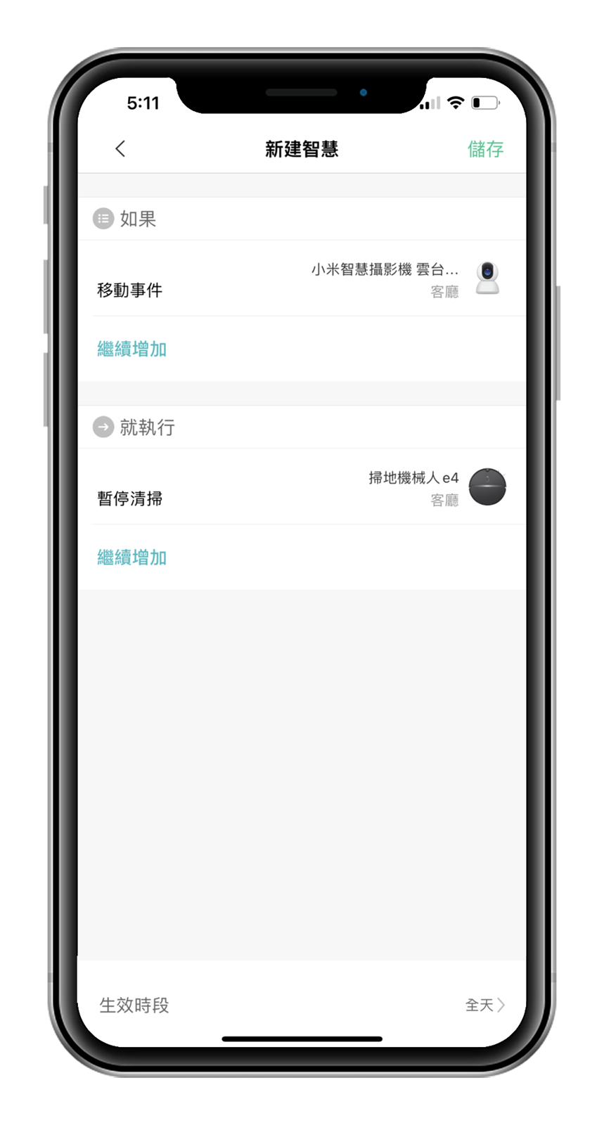 有使用不止一個智慧家電的使用者,也可以有更聰明的多重連動管理模式,例如阿輝就設定如果監視器中偵測到有人的移動事件發生時,就讓掃地機器人暫停打掃,有時候可能是阿輝在電話中走進客廳,那麼如果掃地機器人正在打掃中的話,監視器偵測到我進入客廳的移動動作後就會暫停打掃,不發出聲音打擾阿輝通話。