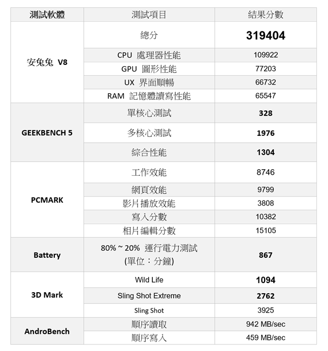 其實除了 CPU 處理器與記憶體,內建儲存空間的讀取/寫入速度也非常影響到日常使用的順暢度,這裡使用 AndroBench 實測讀寫速度,測得的結果為讀取 942 MB/sec MB,寫入為 459 MB/sec