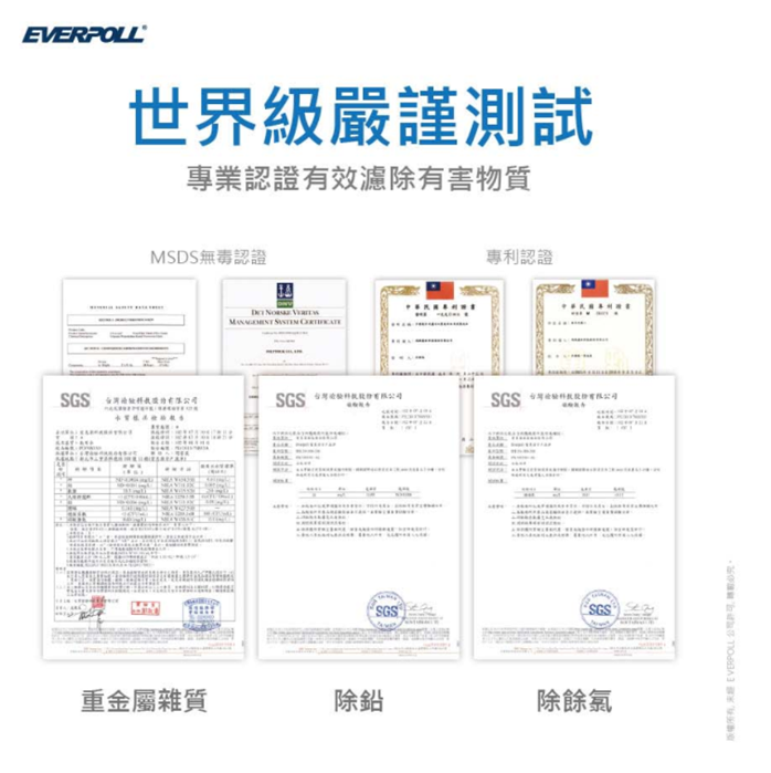濾芯濾除有害物質的能力當然也都具有 SGS 、 MSDS 無毒認證等等的專業認證,不管是看不見的重金屬材質,或者是曾經在新聞上一度熱議的除鉛能力它都具備,透過 EVERPOLL 摺疊雙效複合式濾芯送出像天然礦泉水等級的水源就靠它,得到好的水來源之外,喝的洗的都健康,也能讓家中原先就有安裝的其它生飲設備的濾芯壽命延長,可以說是一舉數得。