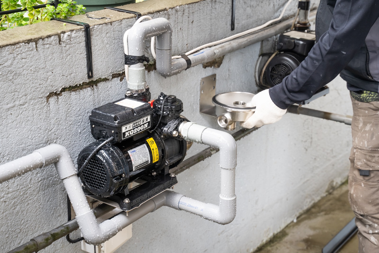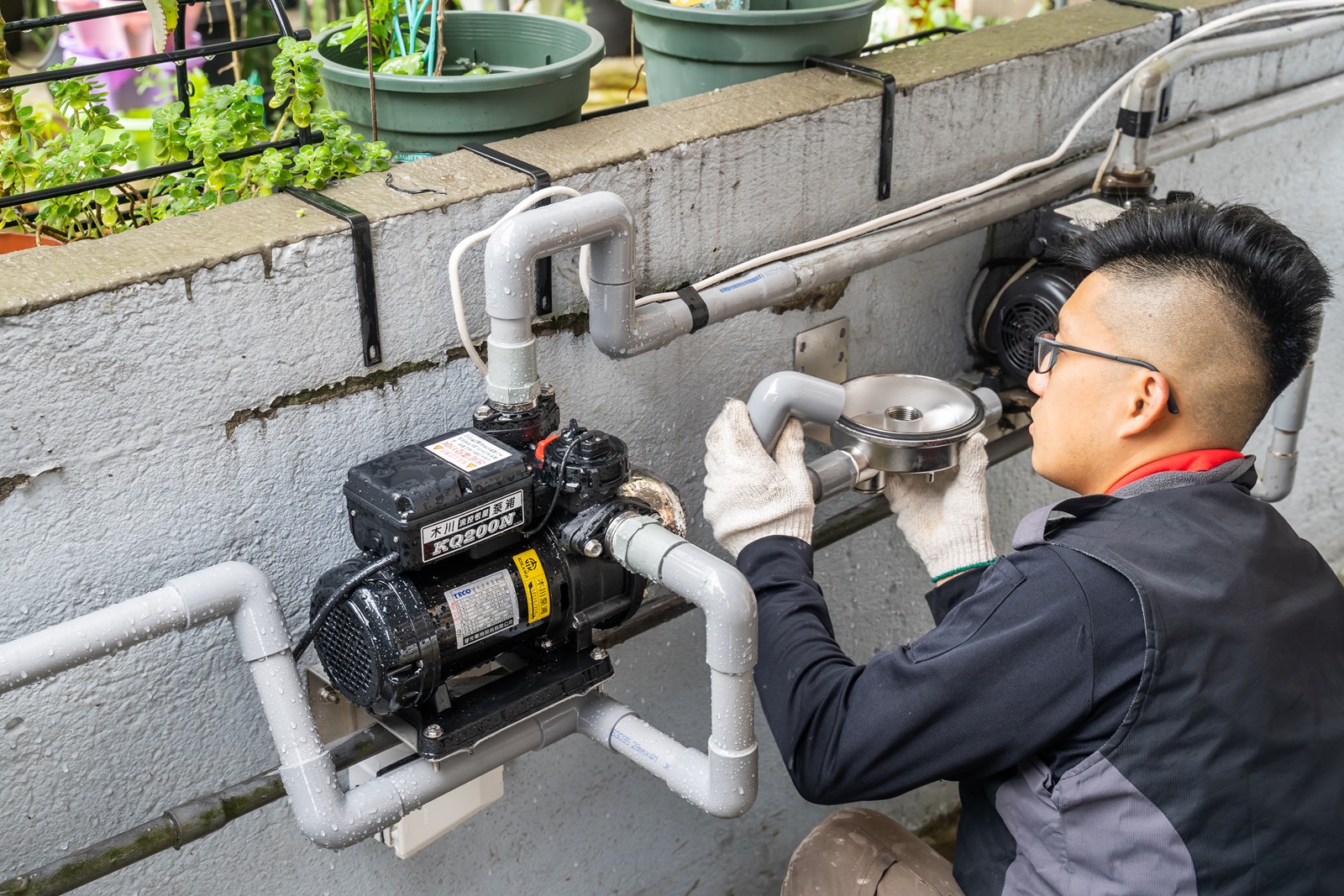 不管是什麼家用品,阿輝最喜歡的就是網購了,只要上網訂購之後,EVERPOLL 就會有專人先跟你聯繫確認家中的水線狀況及討論可以安裝的地方,接著約定好時間就會派專業的工班到家中來進行安裝。阿輝因為是住在 5 樓老公寓的 5 樓,所以選擇直接安裝在頂樓的地方,安裝的位置則是在加壓馬達之後,前往來家中安裝的小哥會先確認好安裝的地方後開始施作,照片中看到得就是 EVERPOLL FH-151 的底座,這個底座有一個『++』形狀的水線通路設計,可以讓這台濾水器正著裝、橫著裝、倒著裝都沒有問題。