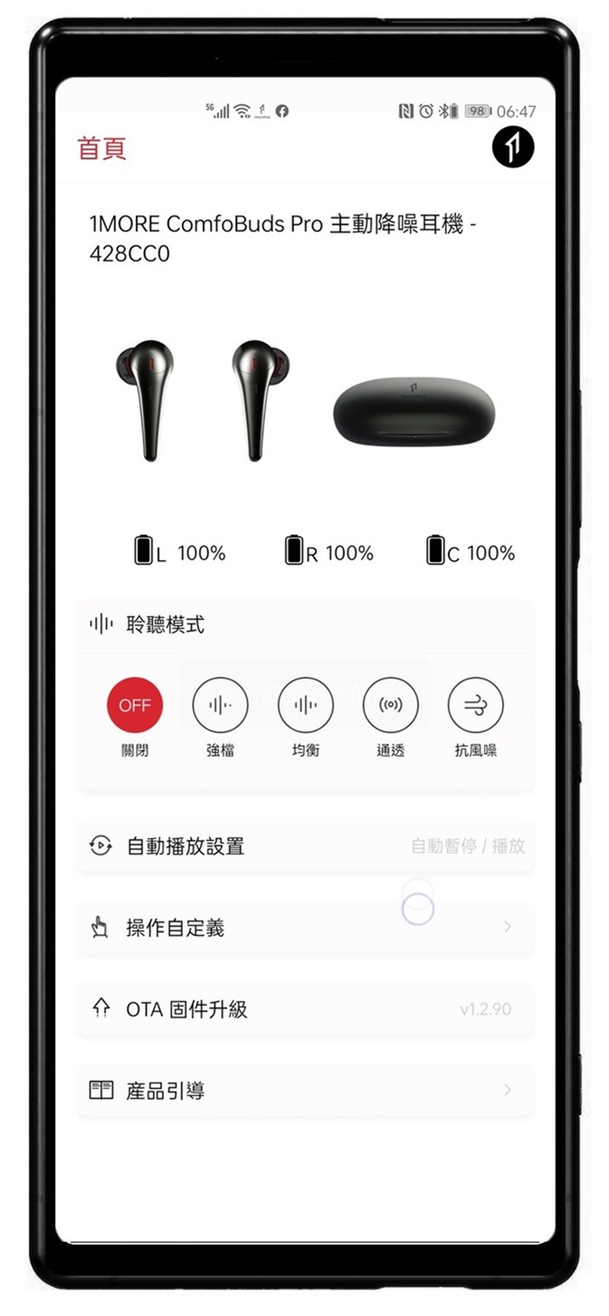 這裡也強烈推薦安裝 1MORE ComfoBuds Pro 的手機官方 APP,前面介紹的預設操作都可可以在 APP 中獨立設置,這在市面上是非常非常少見的設計,實在非常加分,包含了多段降噪模式的切換都可以依照自己的喜好加以設定選用