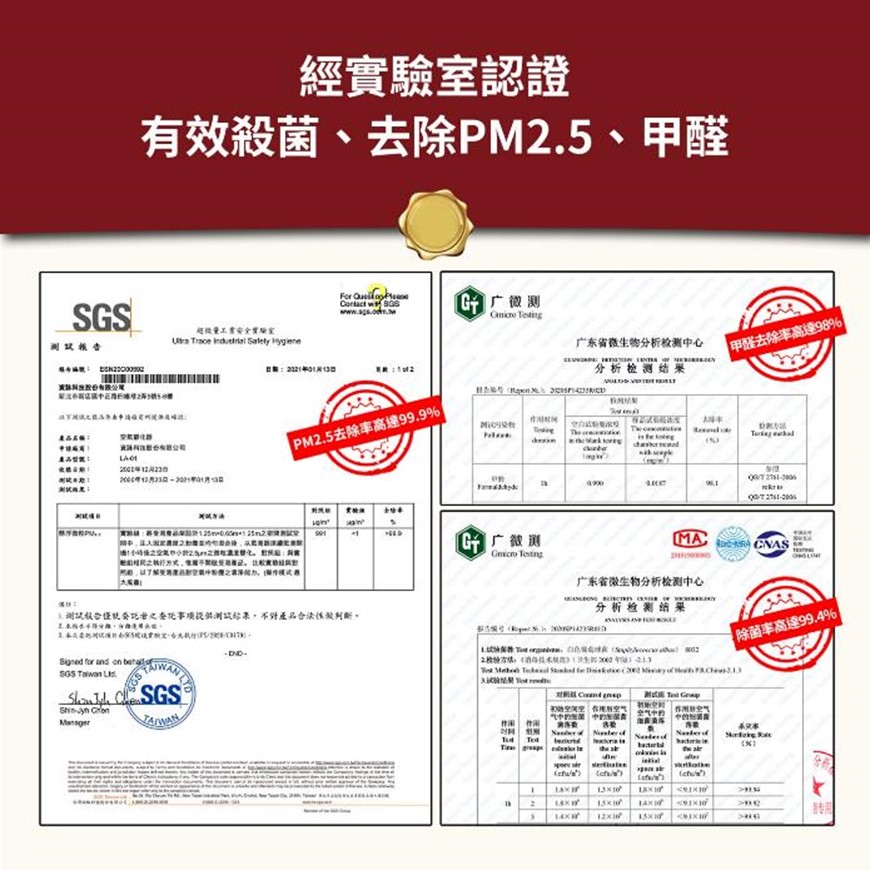 LaPO 的複合式濾網,有 SGS 認證的 HEPA13 高級濾網,多重濾淨系統可以有效去除 PM2.5 、細菌、病毒以及空氣中揮發的有害物質,像是活性碳濾網層濾淨纖維負離子除臭功能,淨化有害氣體、氣味及粉塵,並有奈米清新負離子釋放,沉降氣體污染物,以及過濾奈米級粉塵微粒及過敏原等等功效,讓髒污空氣穿透濾網之後,可以完全濾除髒污之後成為潔淨的空氣,再吹送出來。