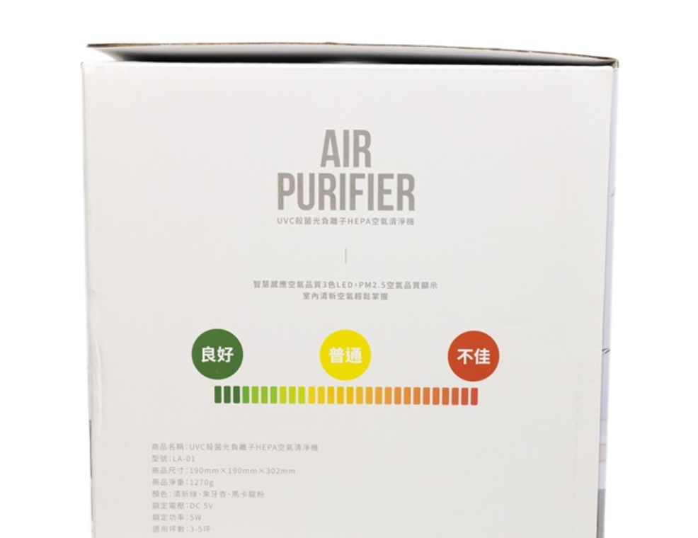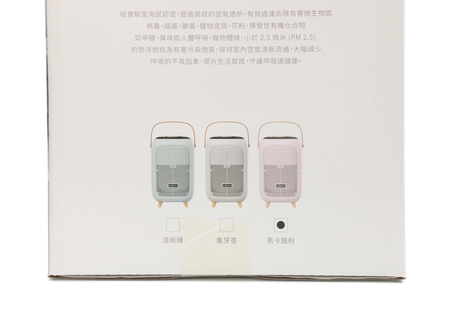 背面也有三種可供選擇的不同顏色,阿輝拿到的是馬卡龍粉,上方還可以看見一些說明文字,會簡單說明 LaPO 經過實驗室認證的強悍空氣清潔能力。