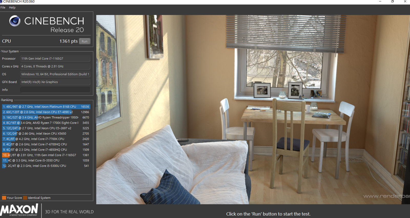 CINEBENCH R20 測試 CPU 得分為 1361 pts