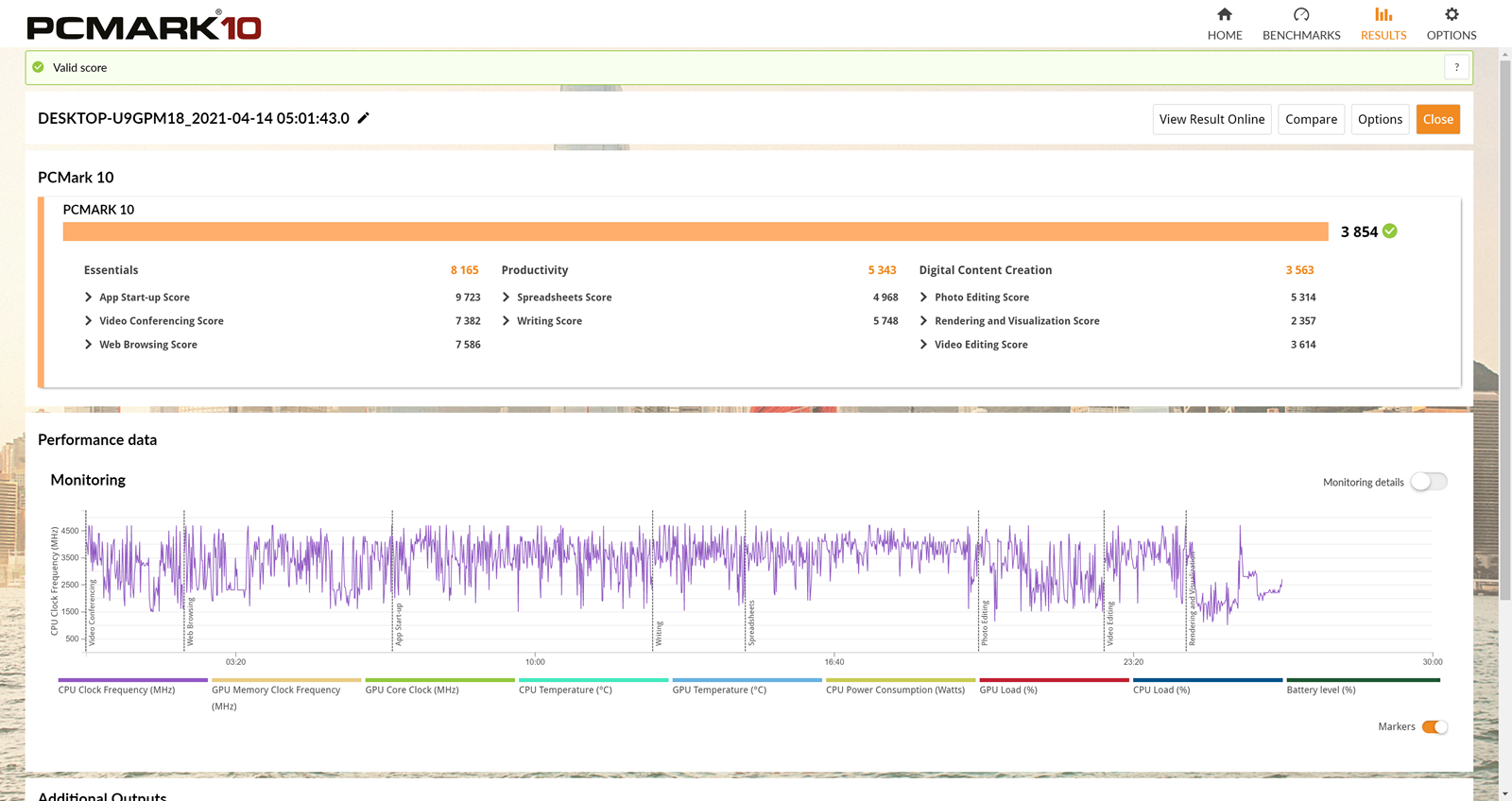 測試最新的 PCMark 10 測試軟體,HP Elite Dragonfly G2內建 32GB 記憶體與高速 SSD 的配置,對於一般商用與家用都十分足夠,PCMark 測試會模擬各種情景包含了辦公軟體處理、影像處理、影片播放剪輯等各種模擬筆電工作的測試,這裡也提供完整測試成績給大家參考。