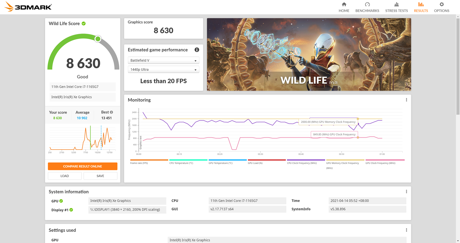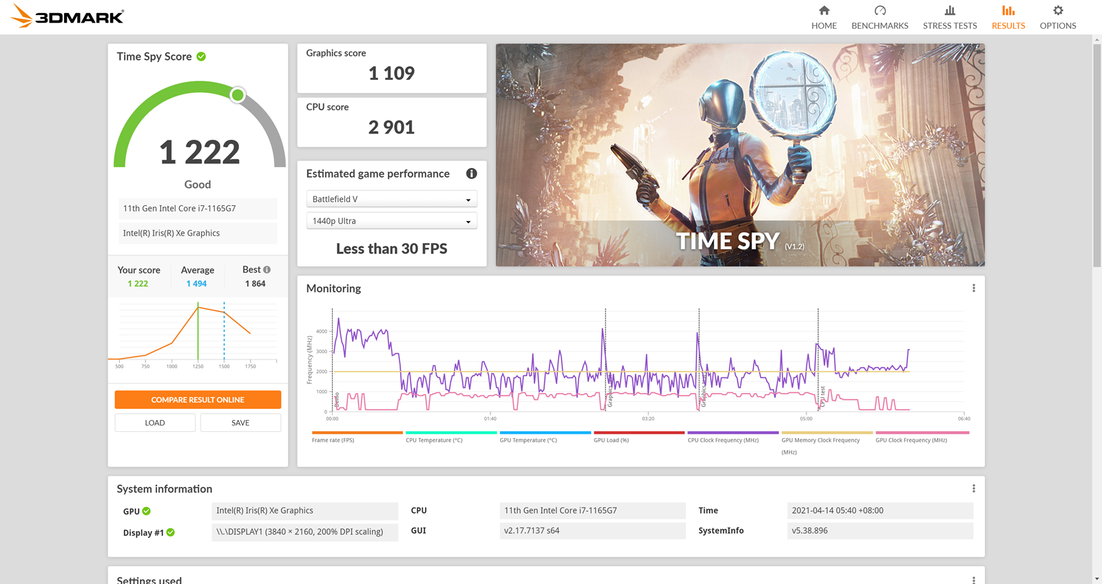 評價 3D 性能的跑分軟體 3DMark,3DMark Sky Diver 測試模式下獲得 14188 的成績,3DMark Time Spy 測試模式下,則獲得 1220 分的分數,幾乎可以說新世代的 Xe 繪圖核心與前一代 UHD 繪圖核心相比性能提升巨大!