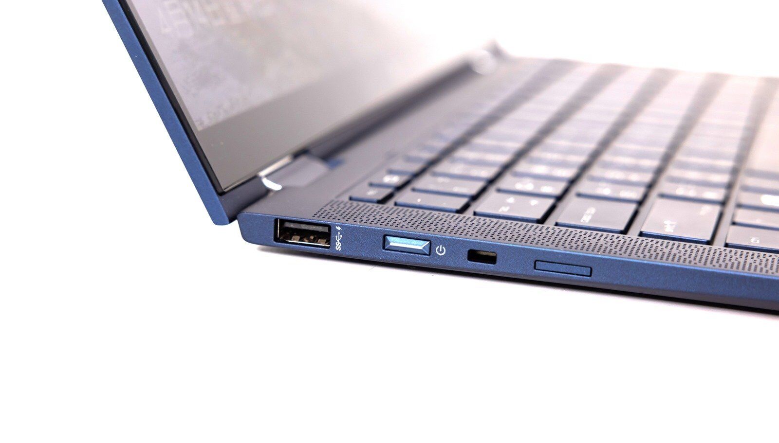 日常使用一定會重視的 I/O 擴充介面部分,HP Elite Dragonfly G2這樣一台輕薄的多合一商務筆電,卻提供了功能介面完整的連接埠。首先是左邊從左到右分別是:最常用與普及的標準 USB 一組(支援 USB 3.1 Gen 2 高速傳輸)、整合燈號的電源按鍵、防盜鎖孔。