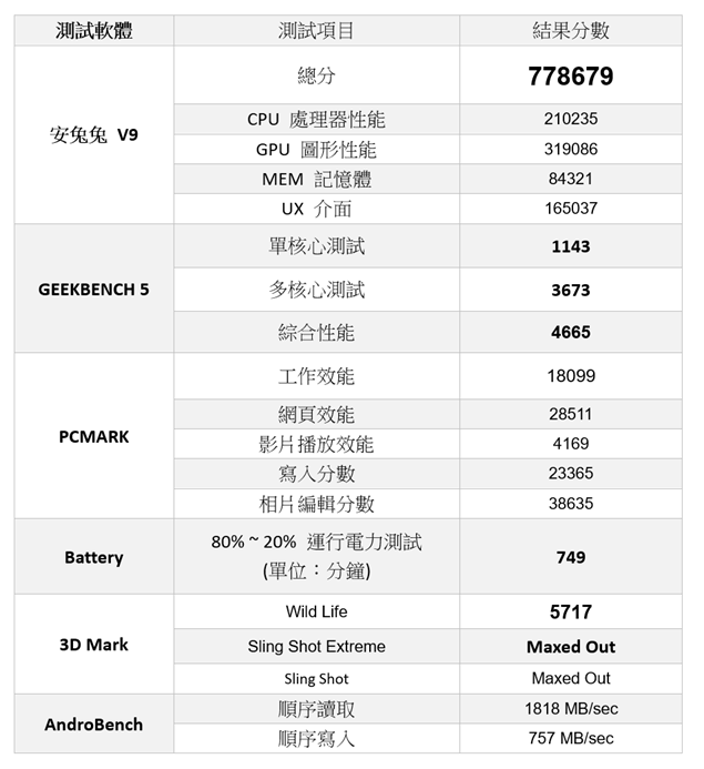 - 高通 S888 處理器,內建 8GB 記憶體 + 256GB 內置儲存空間 (不可擴充) (測試機為 12+128)