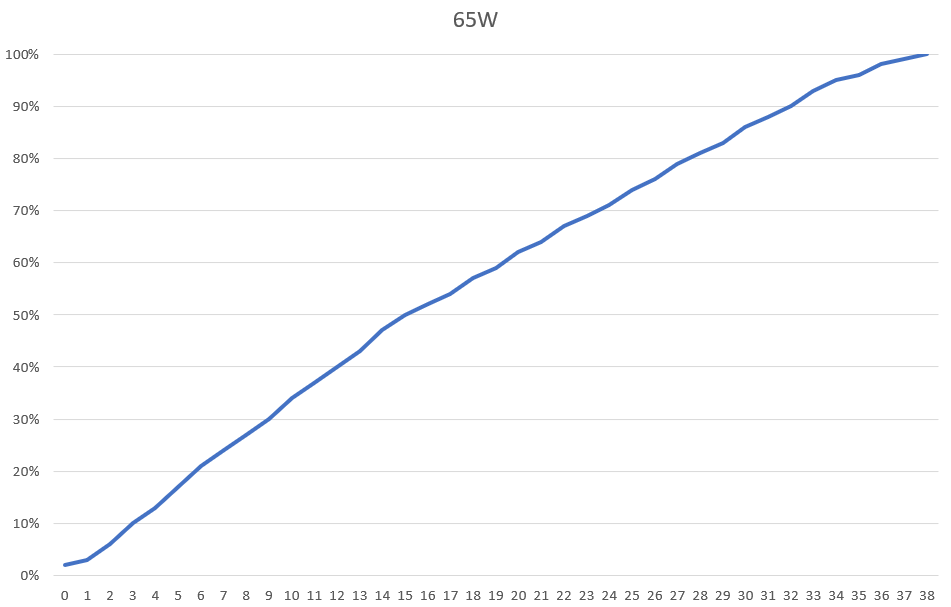 - 手機完整充電到 100% 滿電停止,總共花 38 分鐘時間