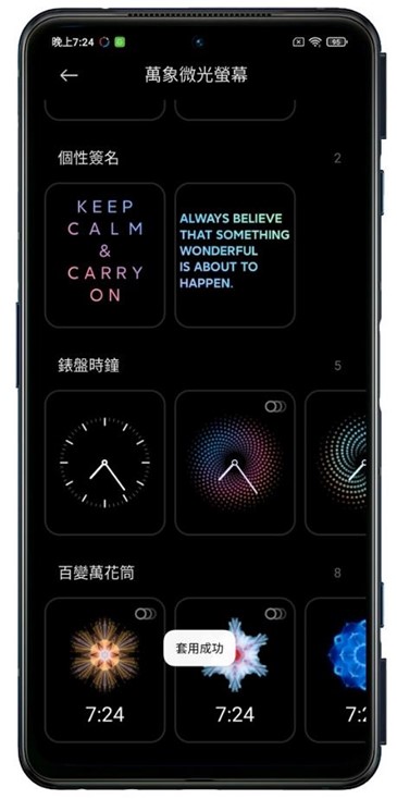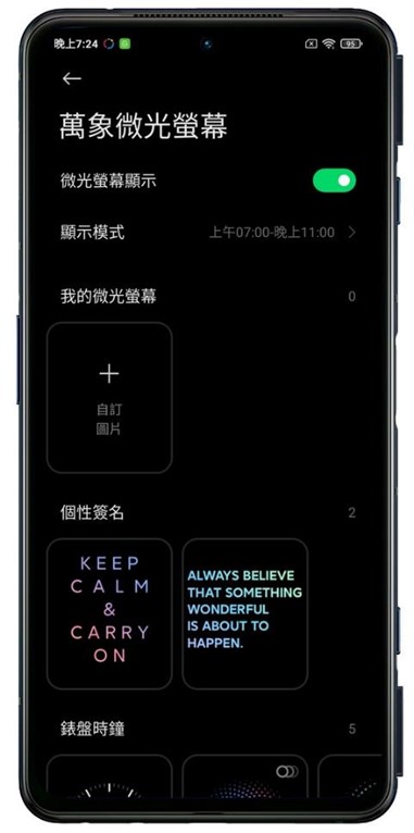 由於 AMOLED 螢幕可以像素點亮關閉的特性,黑鯊 4 自然也是支援了 Always On Display 的功能稱之為微光螢幕,並且也提供了多樣化的主題選擇