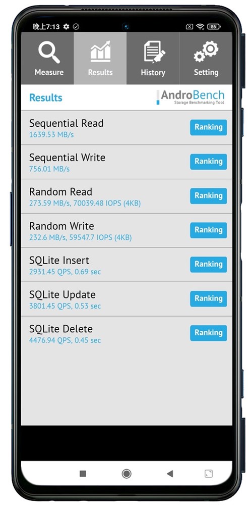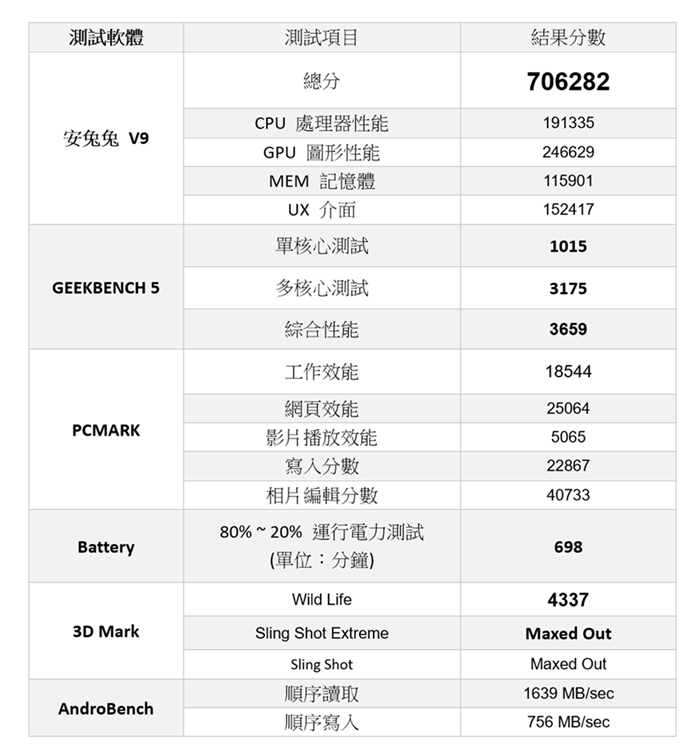 其實除了 CPU 處理器與記憶體,內建儲存空間的讀取/寫入速度也非常影響到日常使用的順暢度,這裡使用 AndroBench 實測讀寫速度,測得的結果為讀取 1639 MB/sec MB,寫入為 756 MB/sec,比較可惜黑鯊 4 並沒有黑鯊 4 Pro 的 Nvem 混合固態硬碟加速技術。