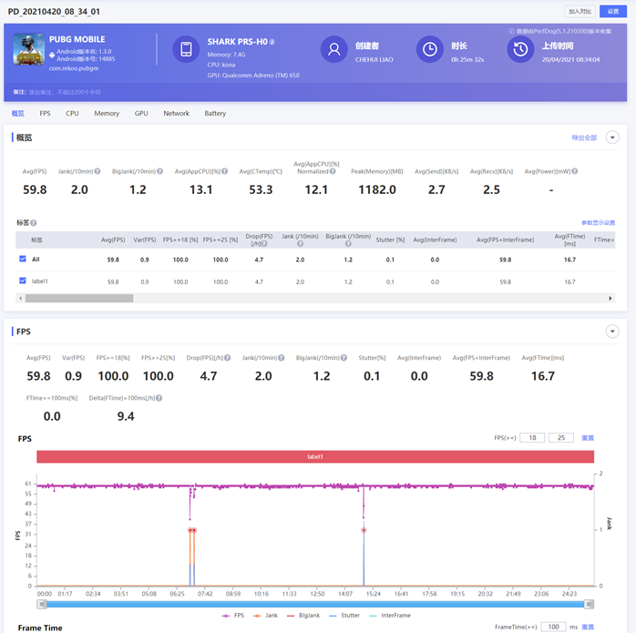PUBG 開啟到最高設定基本上也是小菜一碟,平均 59.8 fps,測試總時長 25 分鐘沒有任何掉張數的情形發生,全程幾乎都是滿幀數運行。