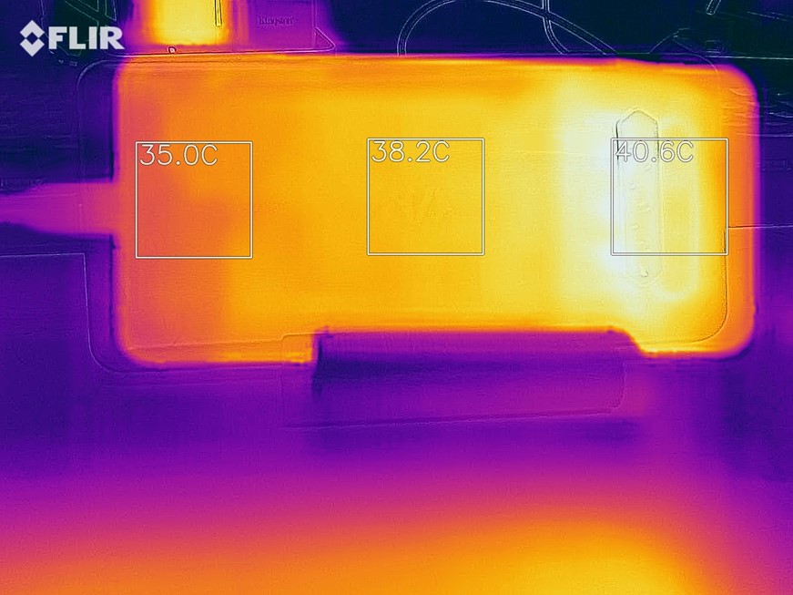 使用紅外線攝影機實際測量機器背部,中央溫度為 37.4 度,握持的兩側溫度較低各為 34 度和 36.1 度