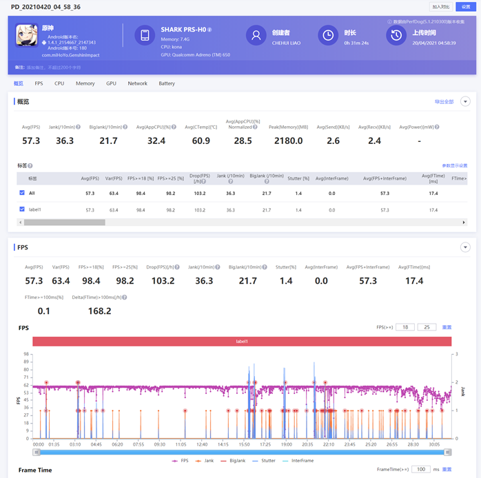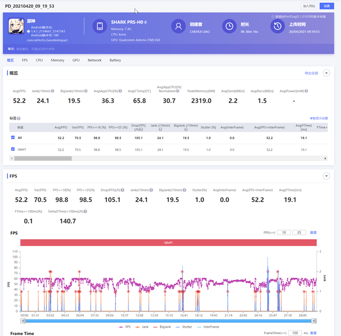 目前公認手機上前幾大高負載的大型遊戲原神,先測試以預設設定(中畫質)並開啟 60 fps 模式,實際進行 30 分鐘的遊戲測試