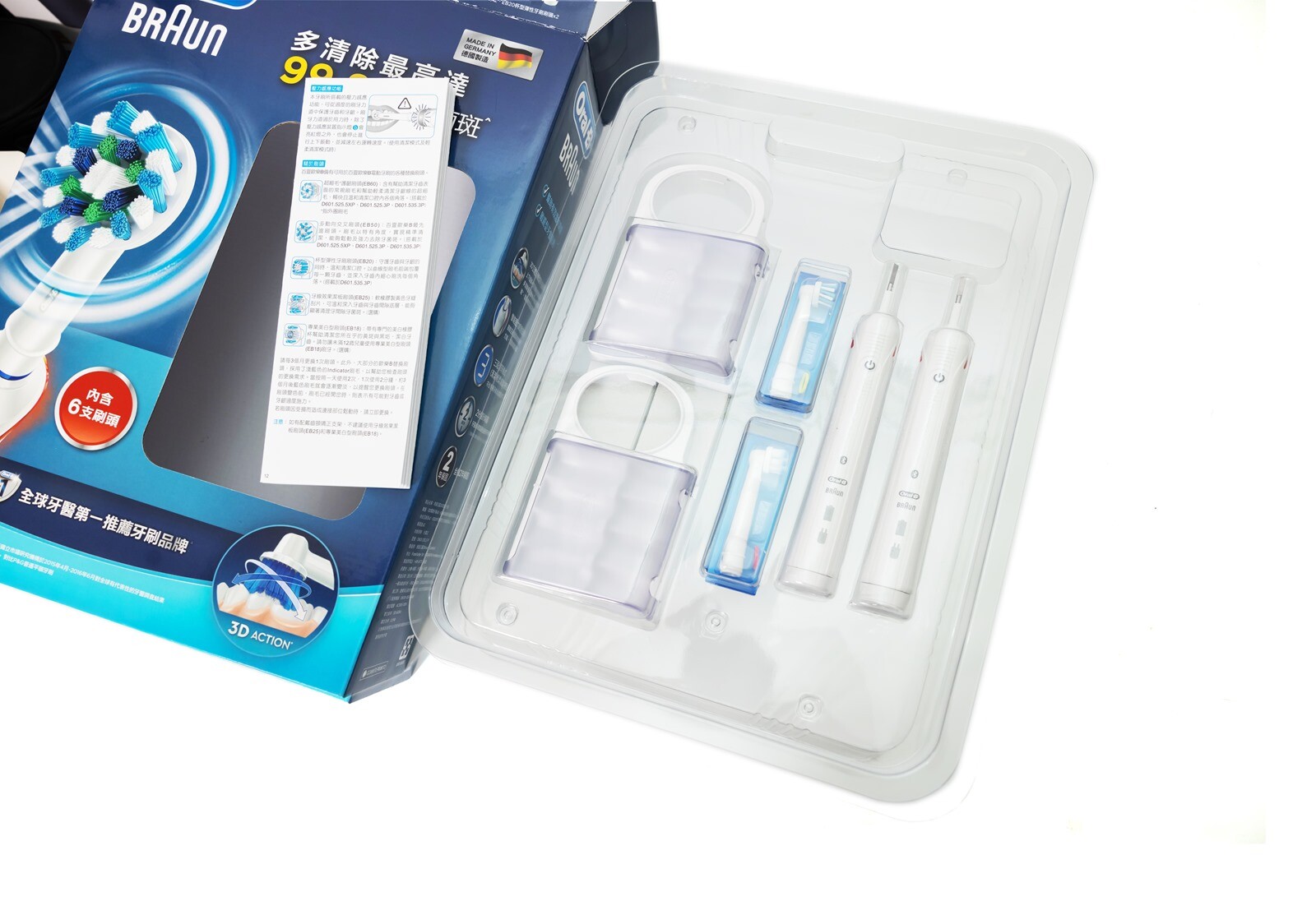 打開盒子之後,可以看到裡面有兩支電動牙刷、替換刷頭以及用來裝刷頭的盒子跟說明書。