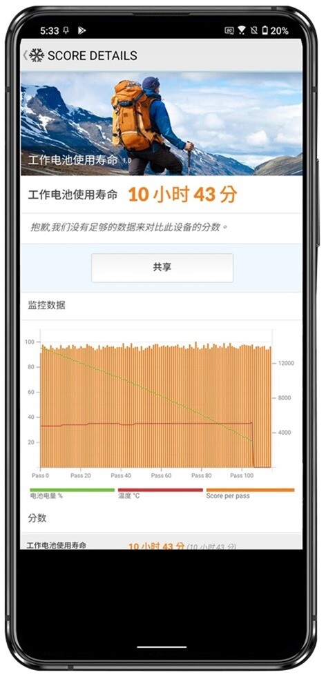 阿輝實際測試 ZenFone 8 Flip 內建電池容量為 5000 mAh,實測電力部分以 PCMARK 做標準測試,測試 80% ~ 20% 間的電力運行,模擬上網、工作、遊戲的混合應用,測試結果為 12 小時 25 分鐘,測試方式與標準可以參考這篇說明。