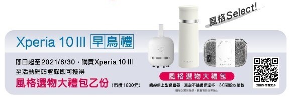 萬元防水夜拍機 Xperia 10 III 不僅親民價格與旗艦級功能令人心動,Sony Mobile 更貼心規劃 Xperia 10 III 早鳥禮「風格選物大禮包」,要讓首波購機的消費者一次帶回多項好禮。自開賣日起至 2021 年 6 月 30 日止,至全台 Xperia 10 III 銷售通路購買 Xperia 10 III,上網完成登錄即可獲得「風格選物大禮包」,內容物包含: 3C 硬殼收納包、簡約桌上型吸塵器、真空不鏽鋼保溫杯共計 3 項好禮一次送! (贈品數量有限,送完為止)