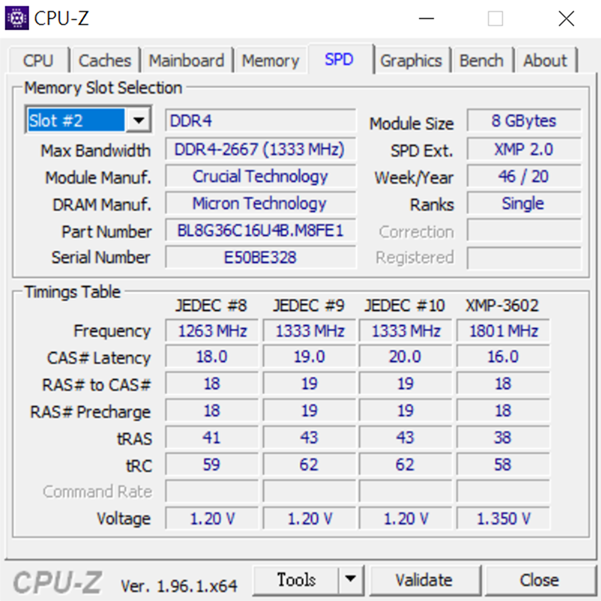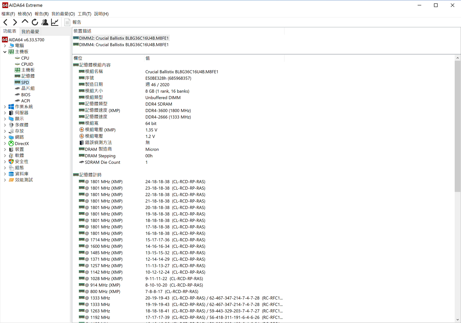 AIDA 64 顯示的記憶體資訊方面 Crucial Ballistix DDR4-3600 記憶體 當然顆粒製造商是 Micron (廢話),JEDEC 預設時脈為 2666MHz,XMP 原廠最佳化可以穩定運作在標示頻率 3600Mhz,這裡也要提到 Crucial Ballistix DDR4-3600 記憶體的一個很大優勢就是 Crucial Ballistix DDR4-3600 記憶體也是市場上唯一一家同時自己就是記憶體顆粒生產廠商的品牌廠商,自然不論是穩定性還是價格都有其優勢!